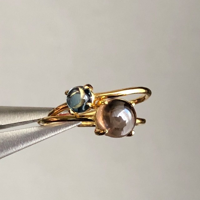 スイスブルートパーズとスモーキークォーツのリングセットです。 (スイスブルートパーズ4mm、スモーキークォーツ4mm) (SILVER925製・18KGP仕上げ) ※ ロジウムメッキタイプ(シルバー色)も対応可能です ※フリーサイズ・7・9・11・13・15号承ります。 商品オプションよりご選択ください_φ(・v・ (画像はフリーサイズのサンプルです) ※天然石を使用したハンドメイドの為、クラックや不揃いな部分があります。