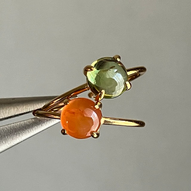 カーネリアンとペリドットのリングセットです。 (カーネリアン6mm、ペリドット 4mm) (SILVER925製・18kgp仕上げ) ※ ロジウムメッキタイプ(シルバー色)もご案内可能です。 ※フリーサイズ・7・9・11・13・15号承ります。 商品オプションよりご選択ください_φ(・v・ (画像はフリーサイズのサンプルです) ※天然石を使用したハンドメイドの為、クラックや不揃いな部分があります。
