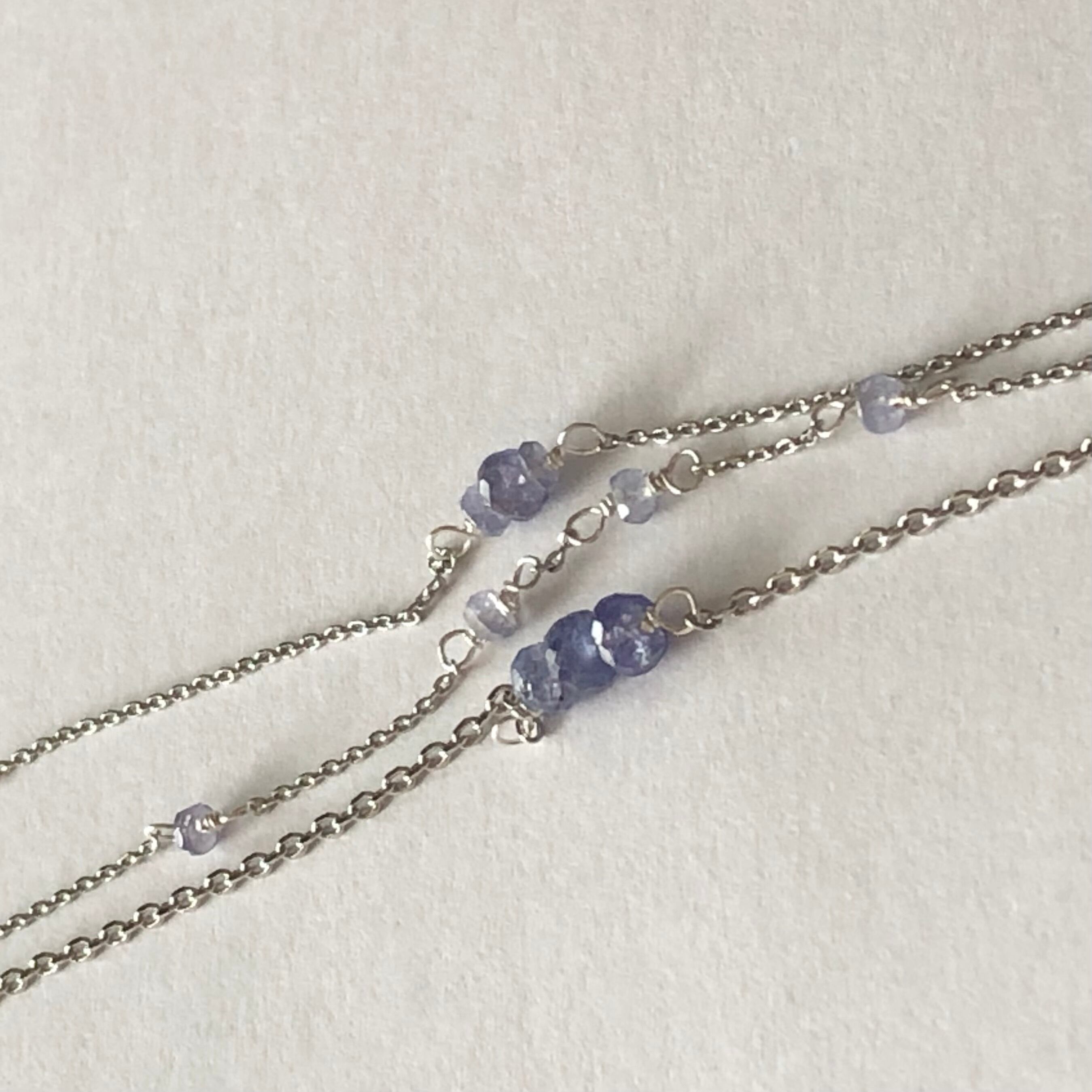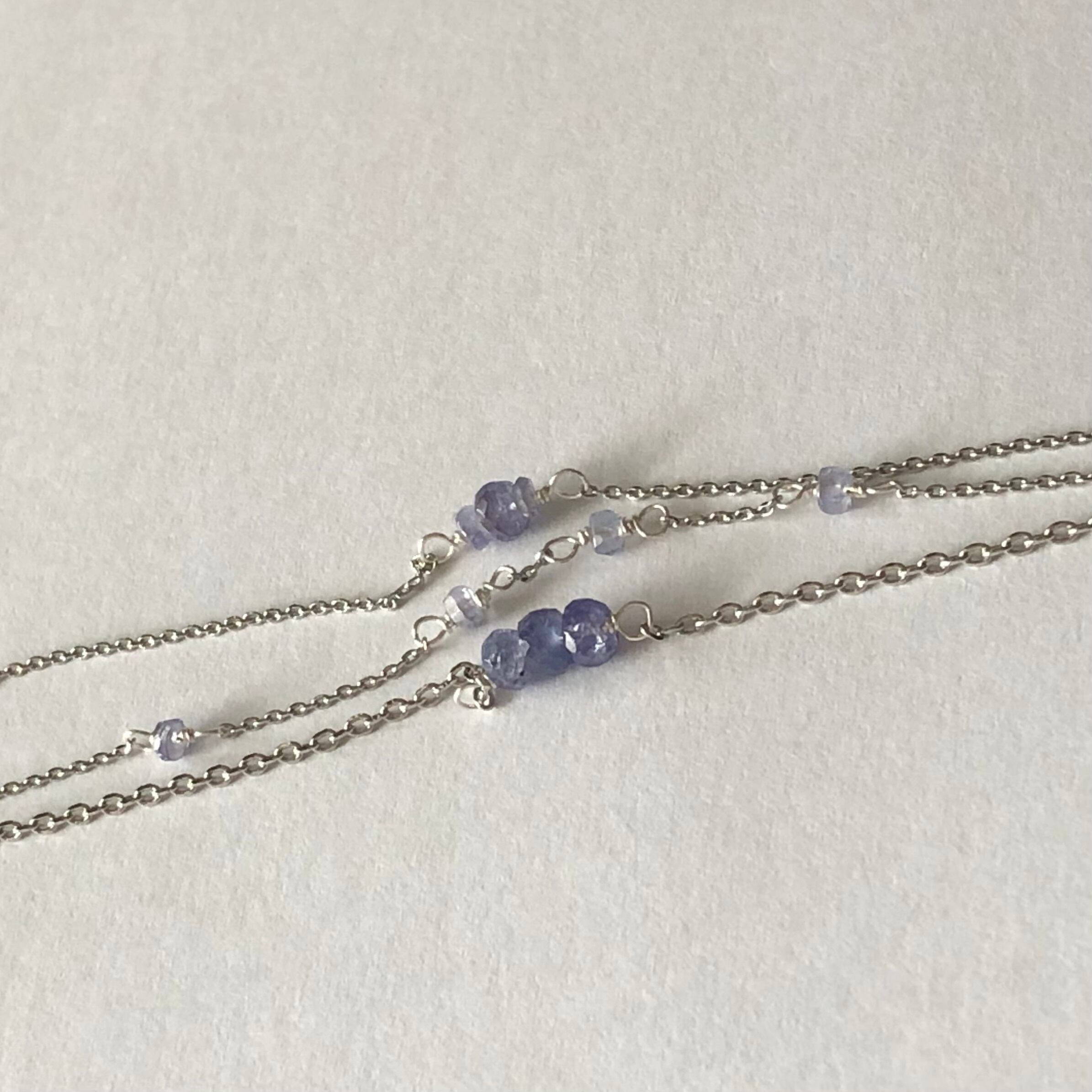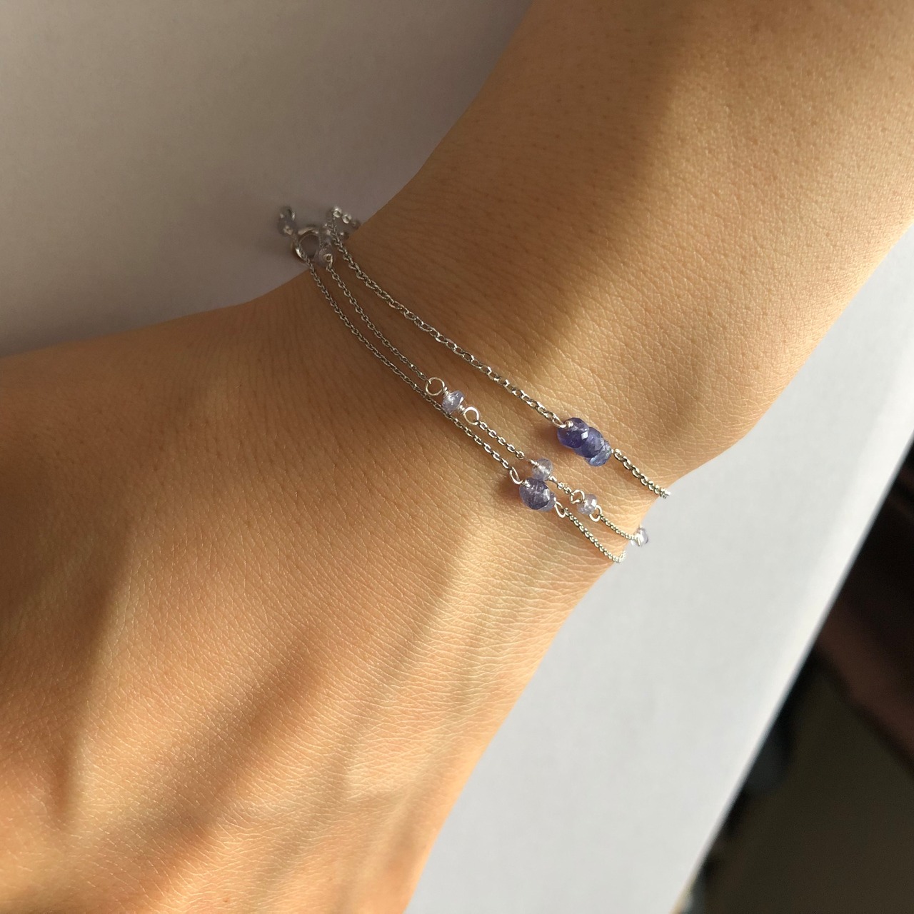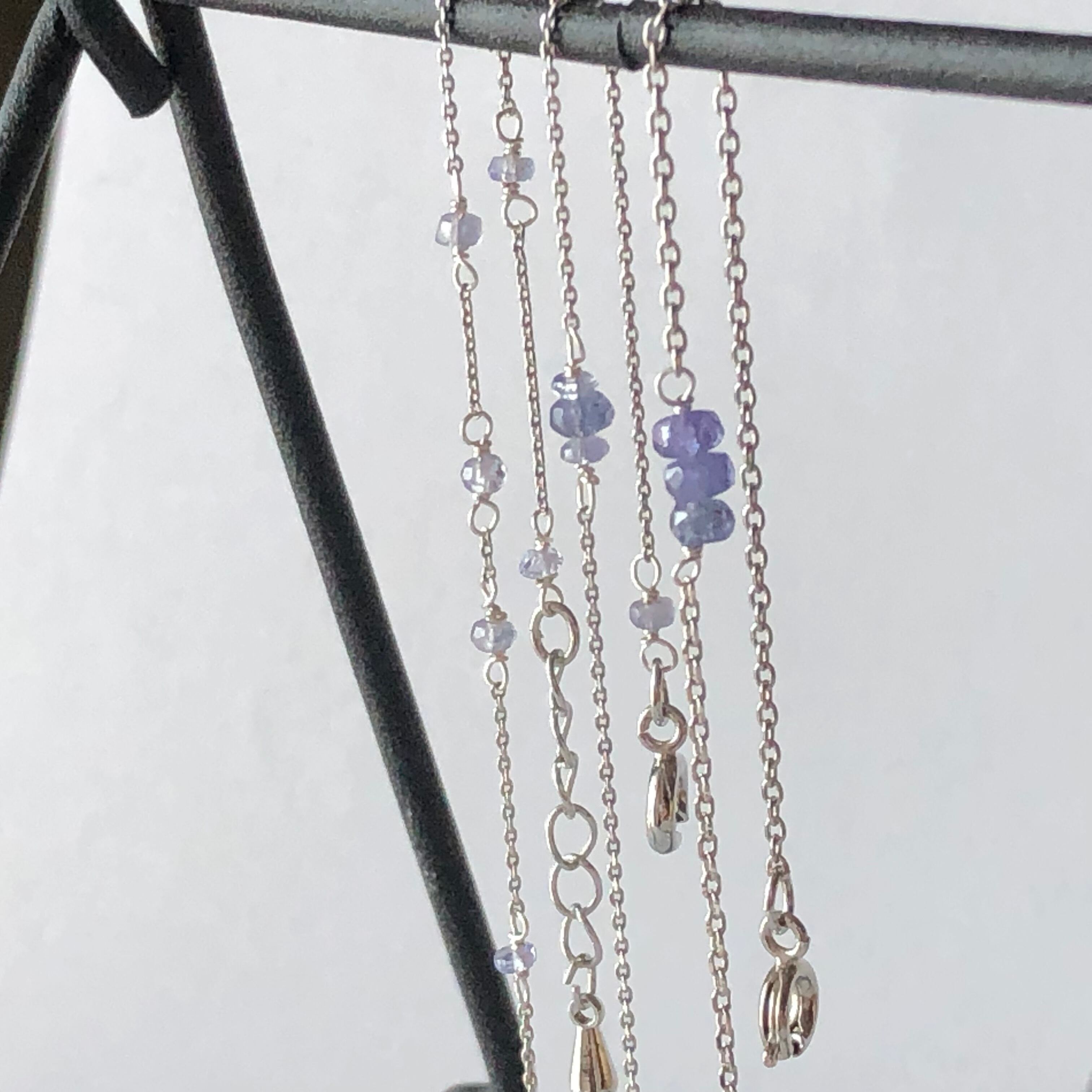 シルバーカラーのチェーンとブルー〜バイオレットの淡い色が夏に涼しいタンザナイトのブレスレットセットです。