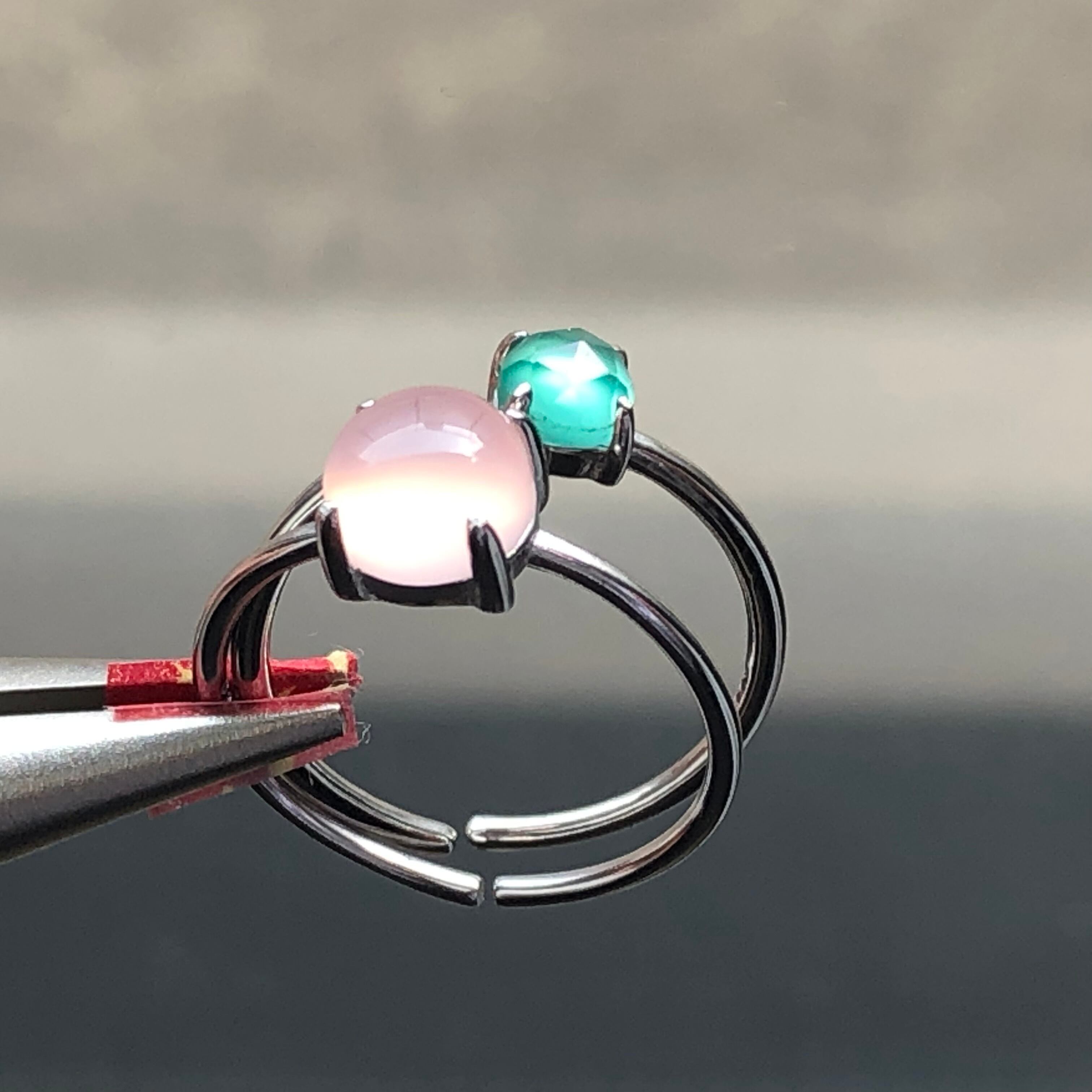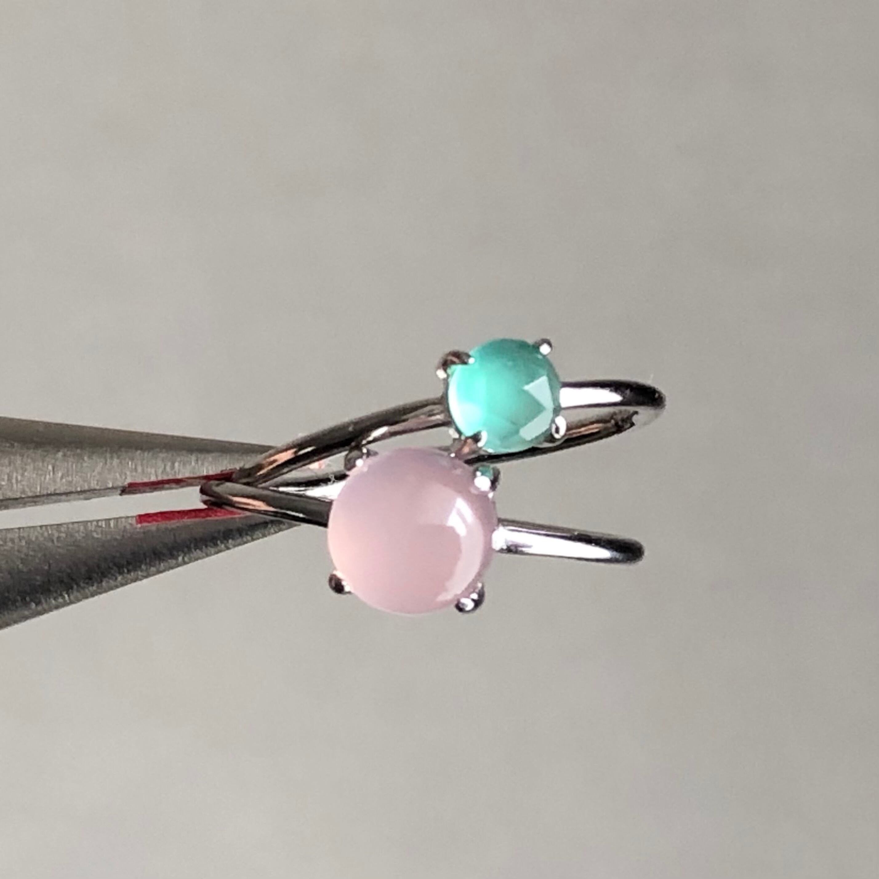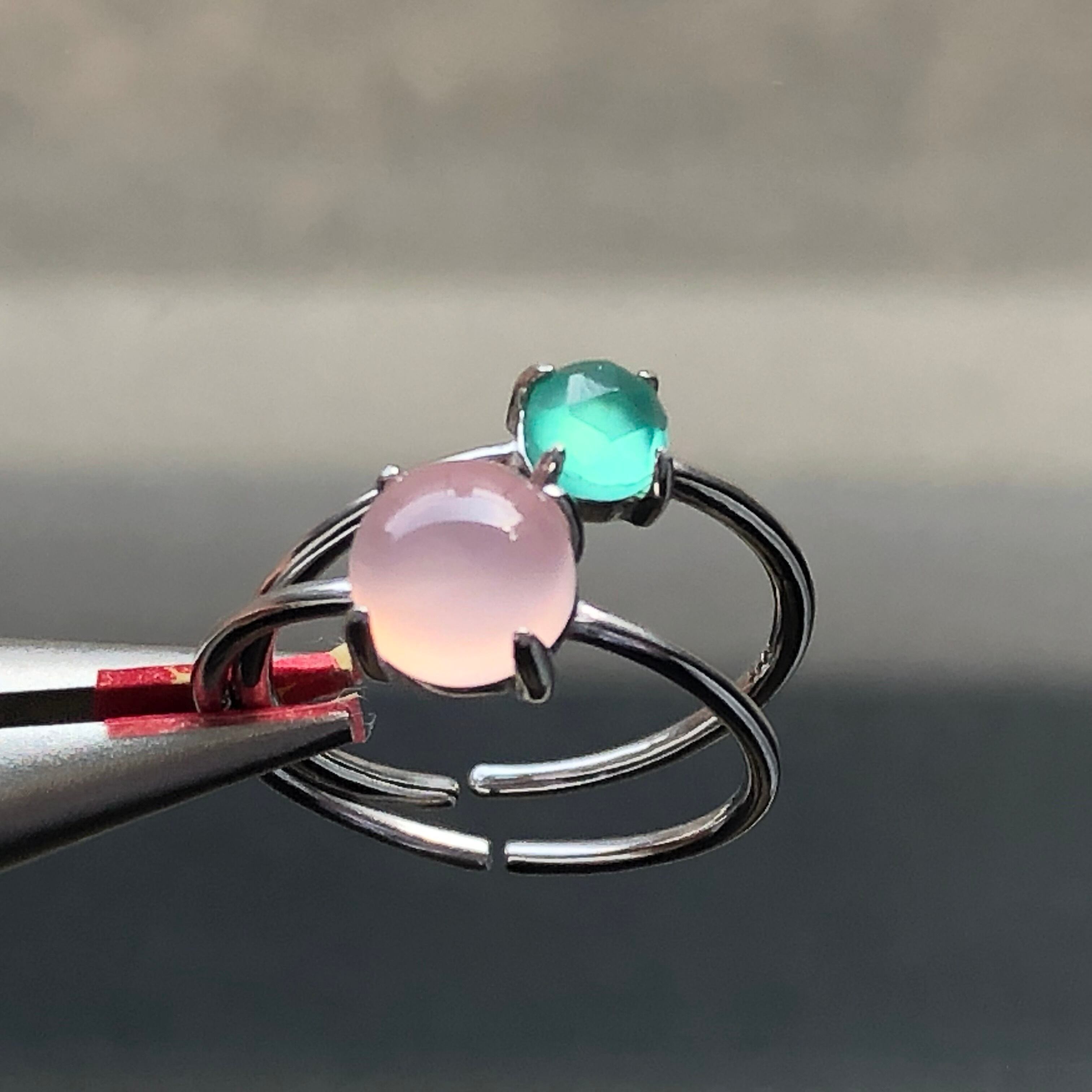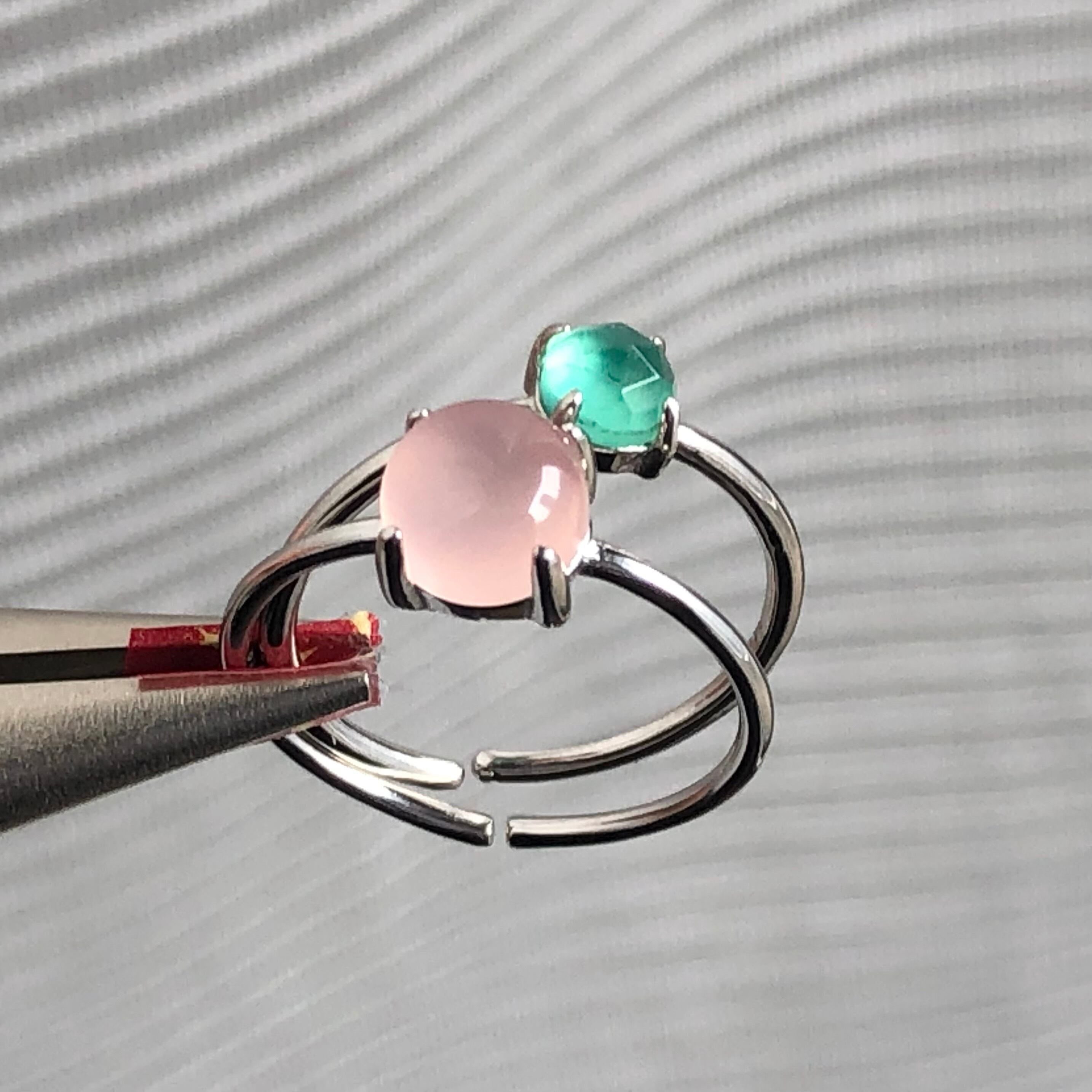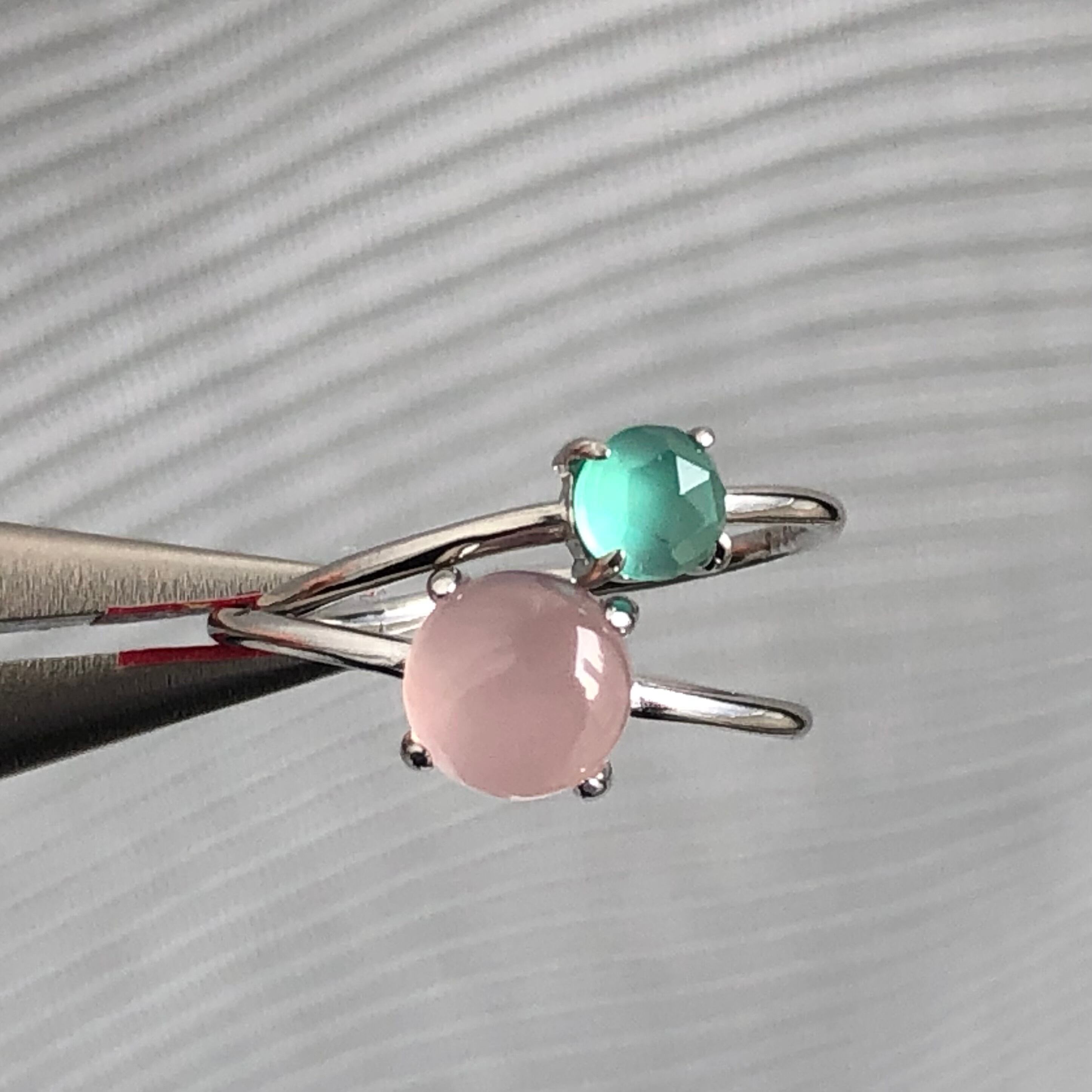 ピンクカルセドニーとグリーンオニキスのリングセットです。