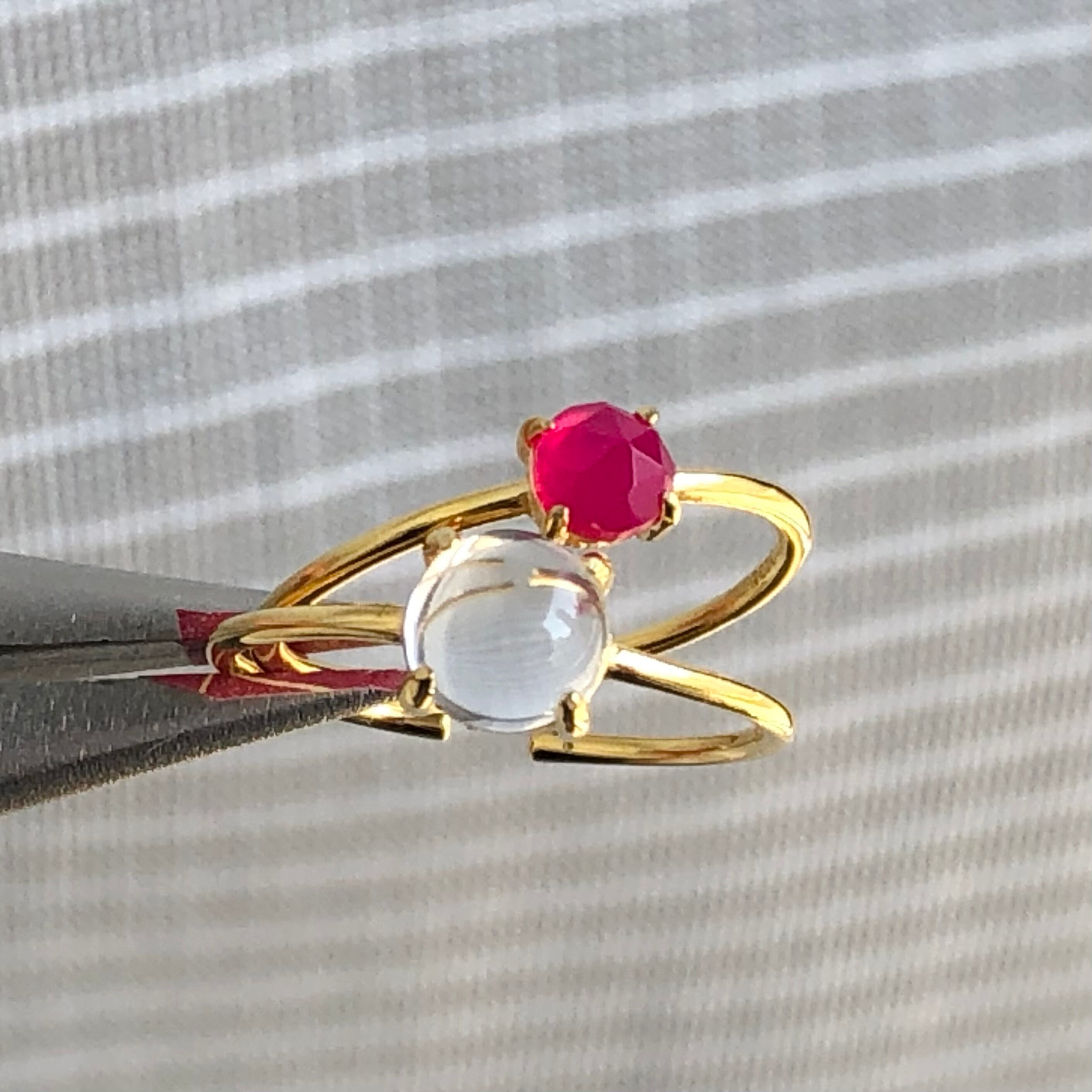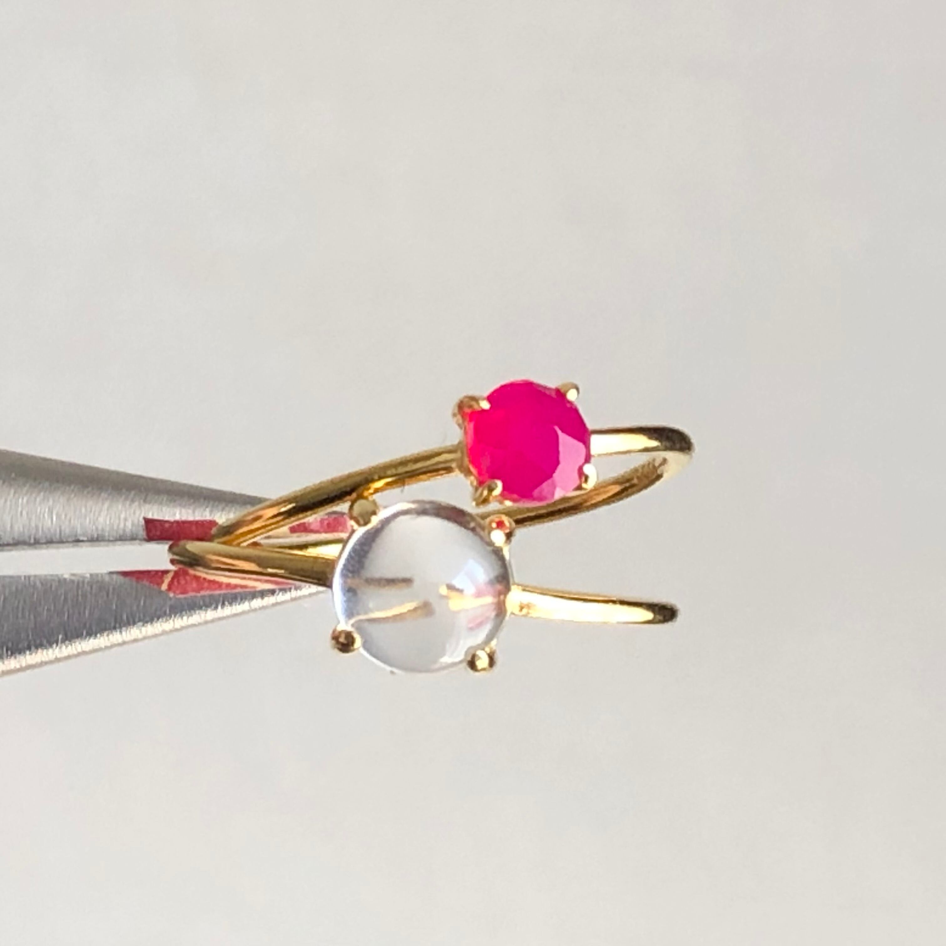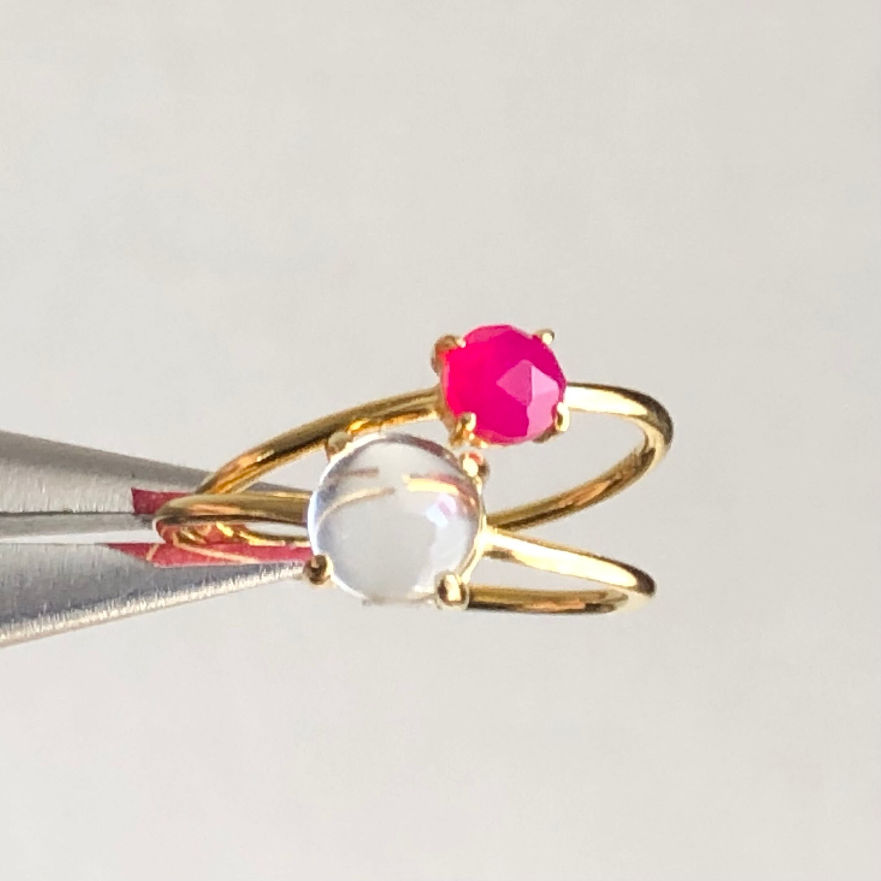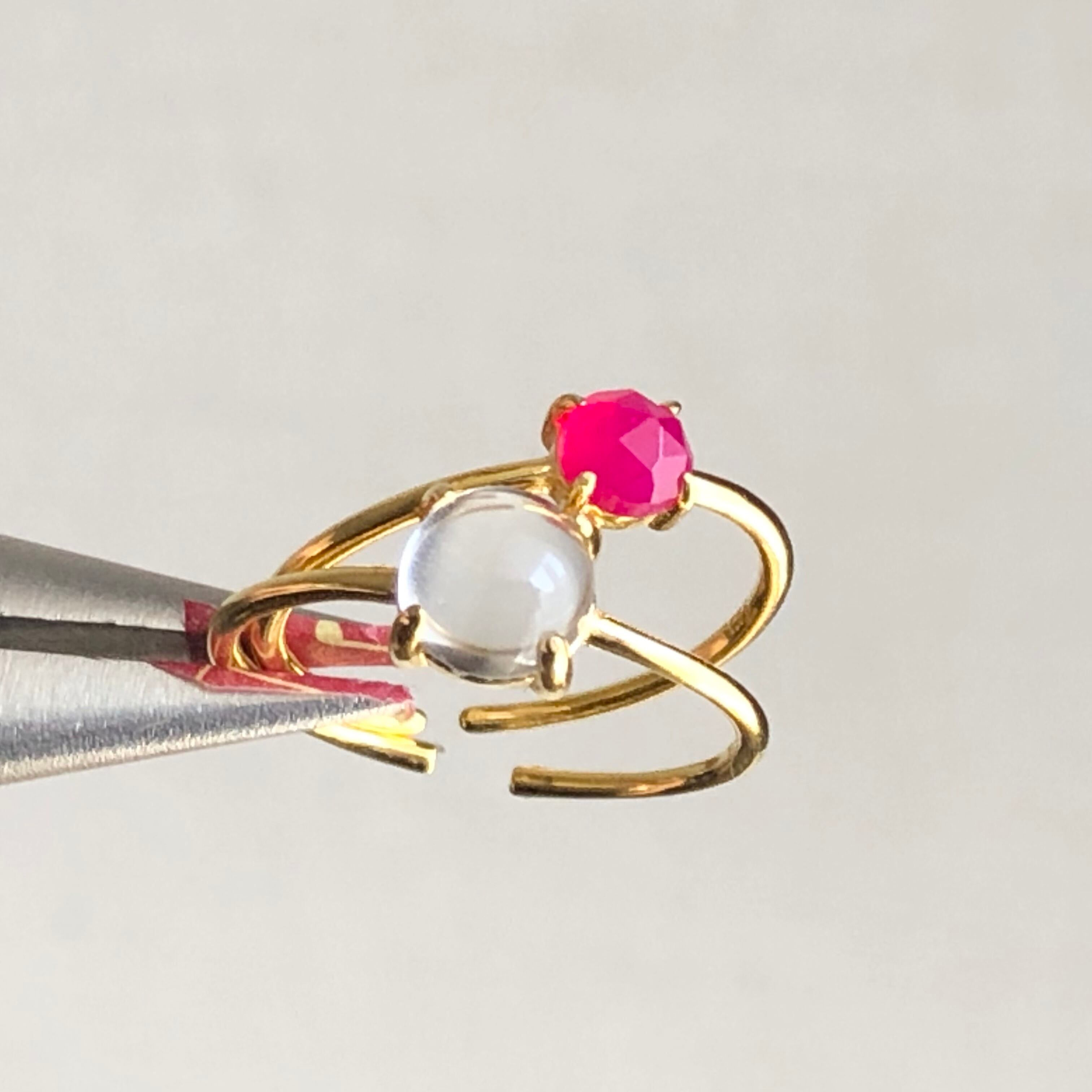 ローズカットのフューシャピンクカルセドニーとクリスタルのリングセットです。