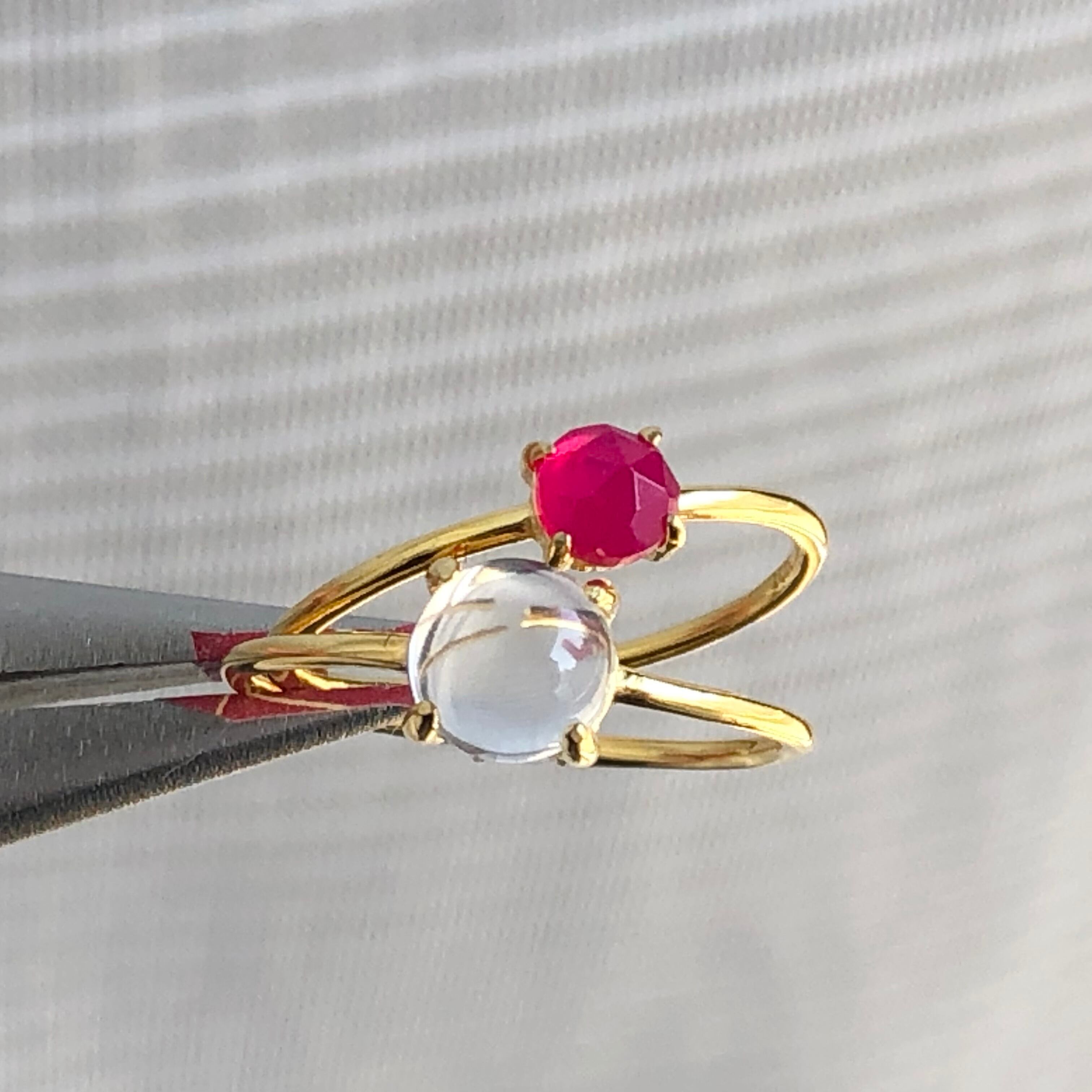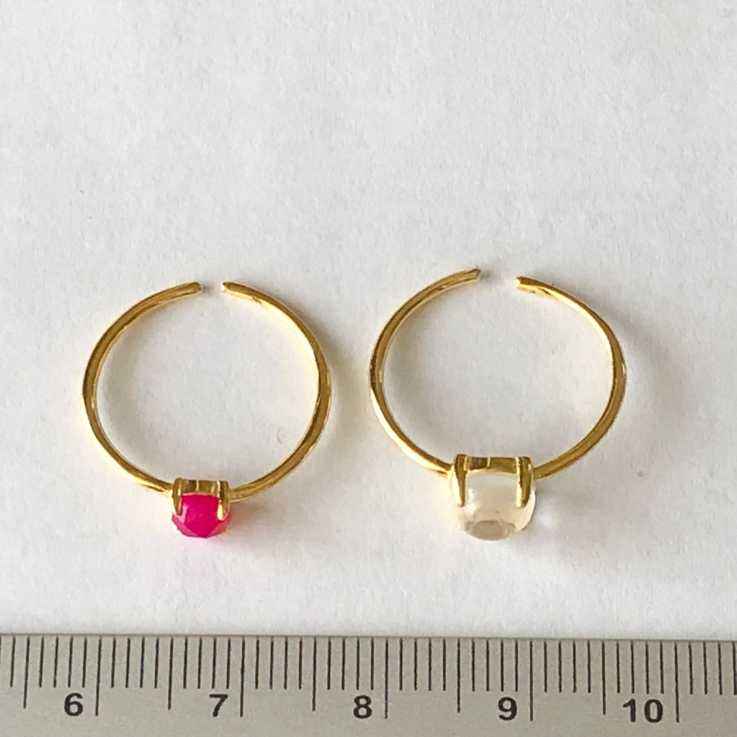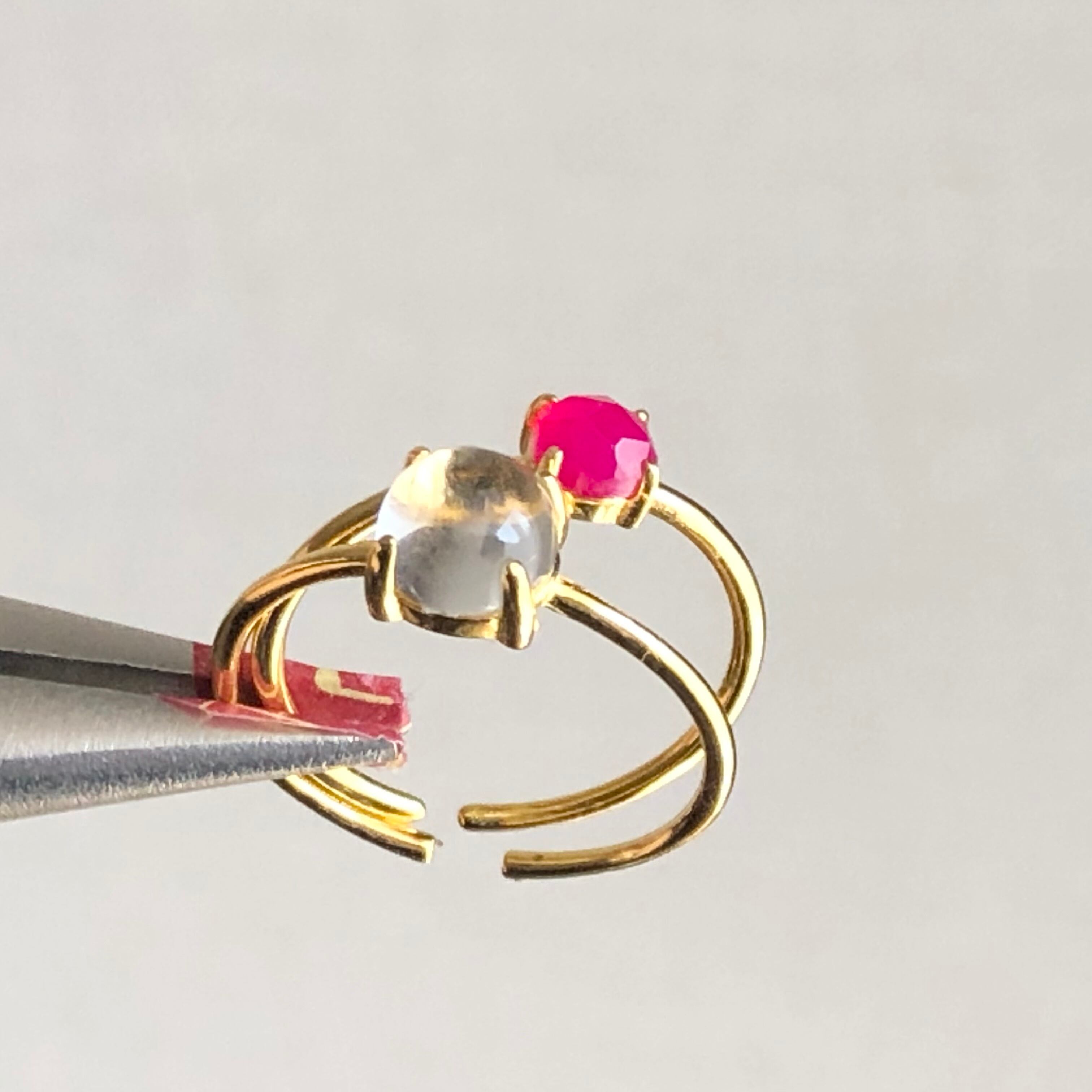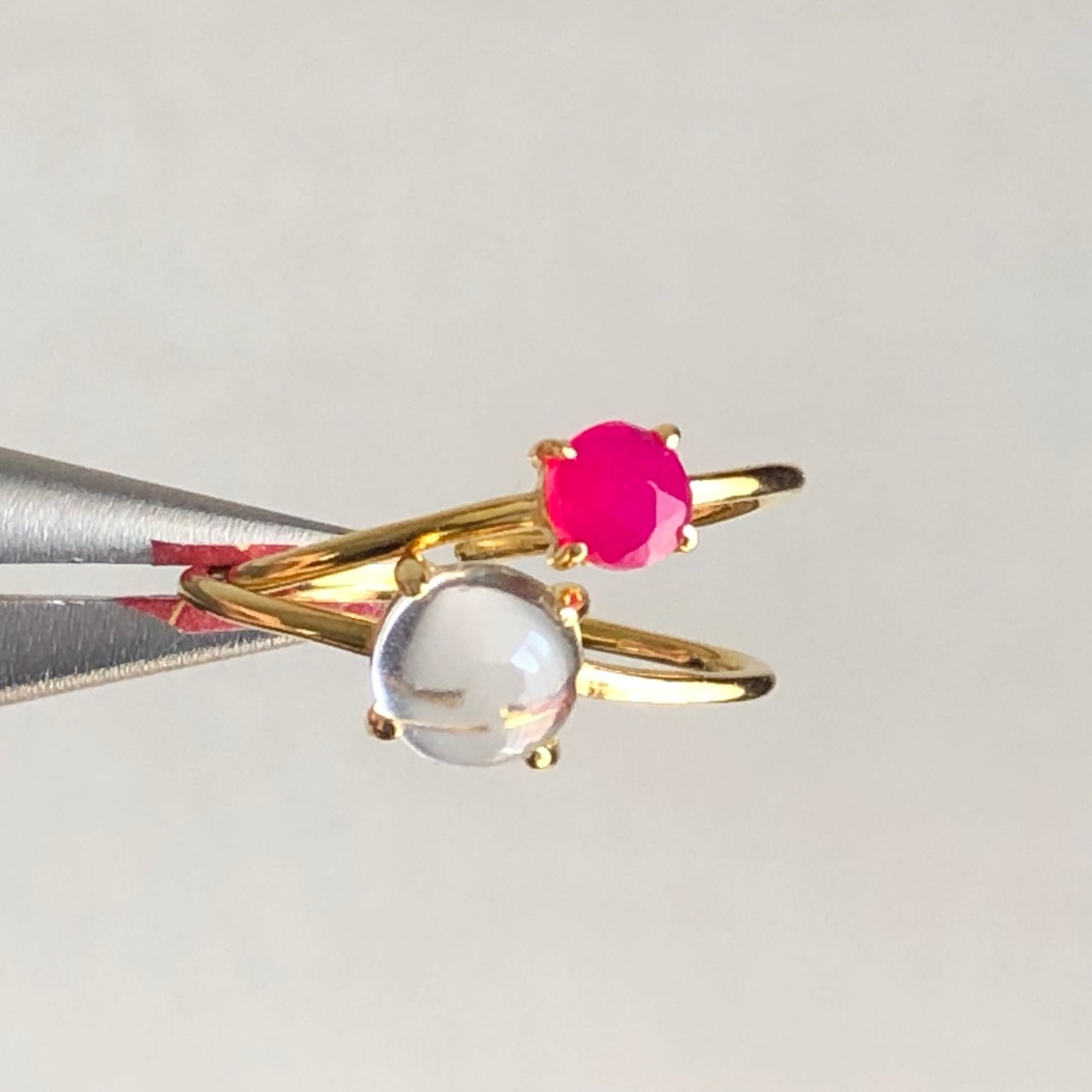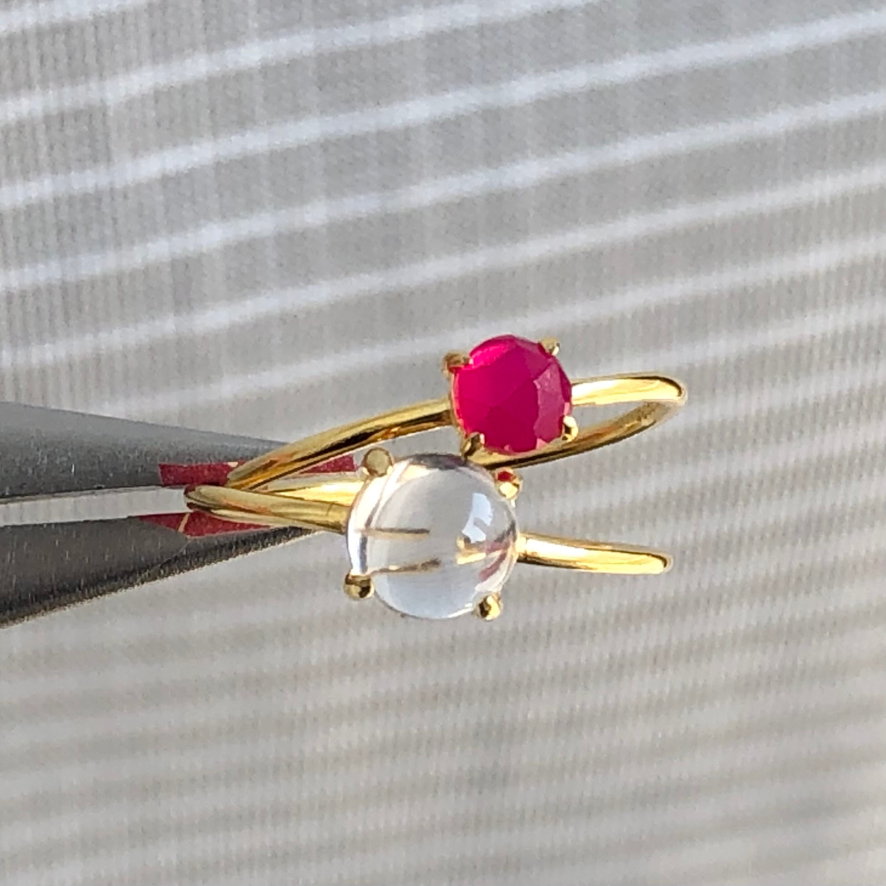 ローズカットのフューシャピンクカルセドニーとクリスタルのリングセットです。