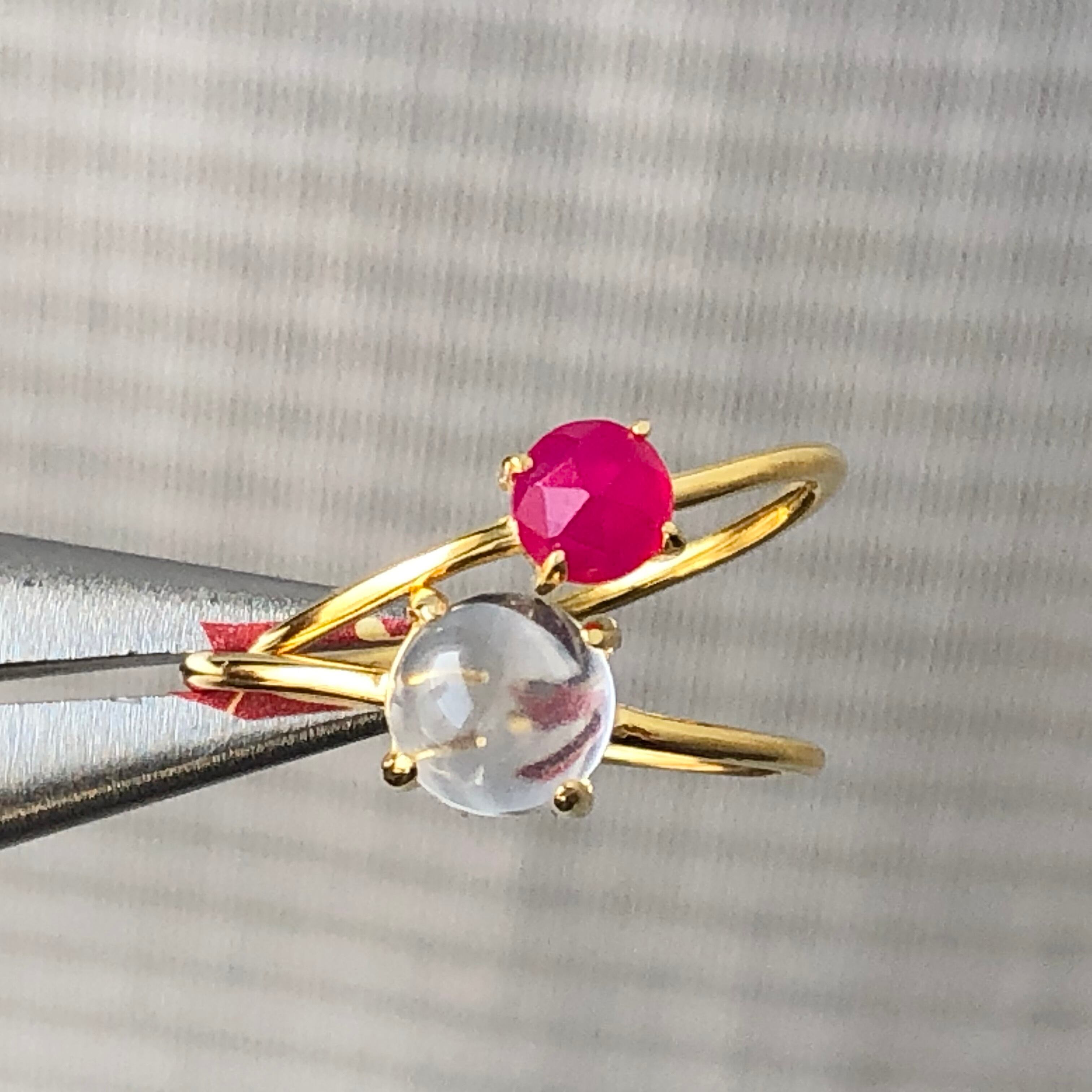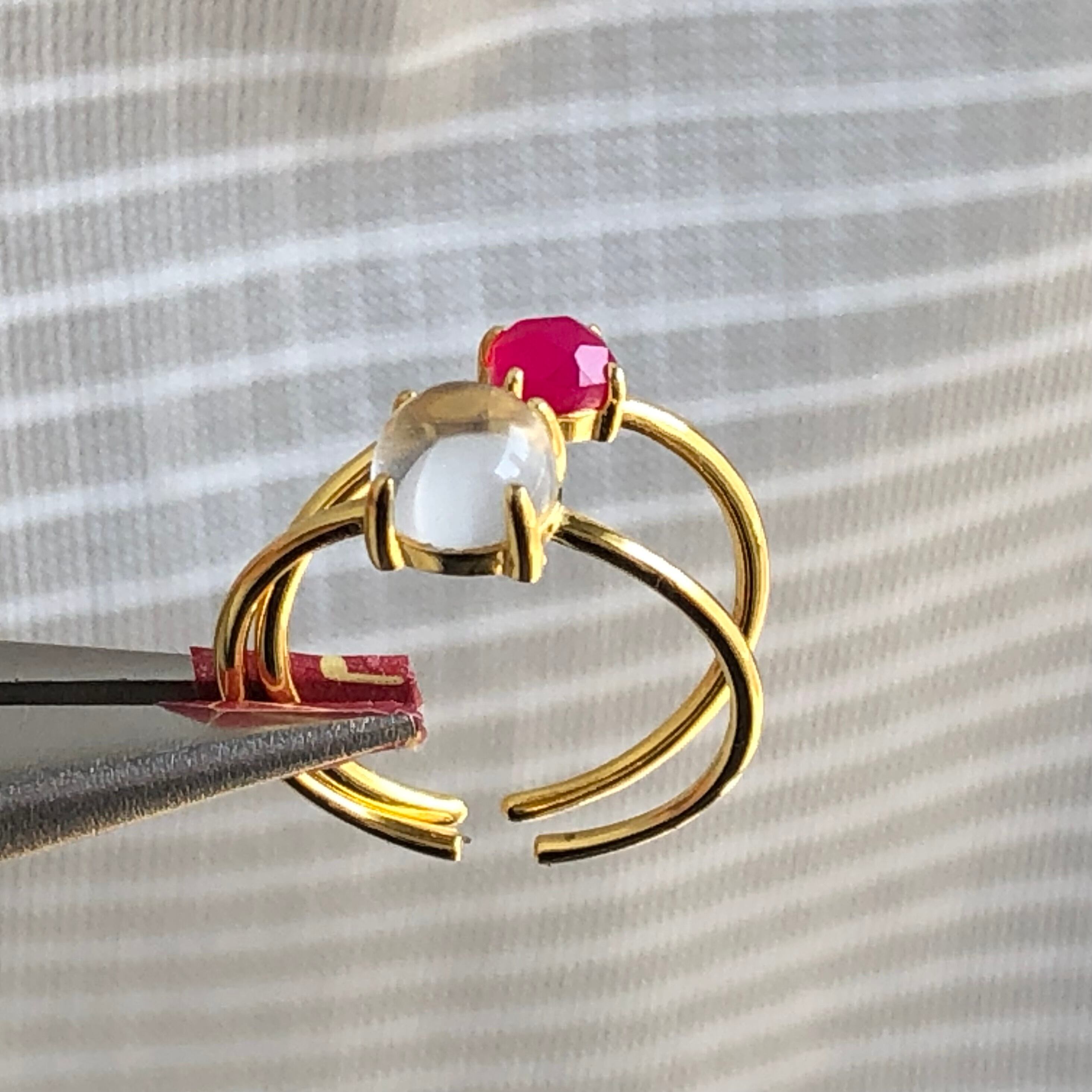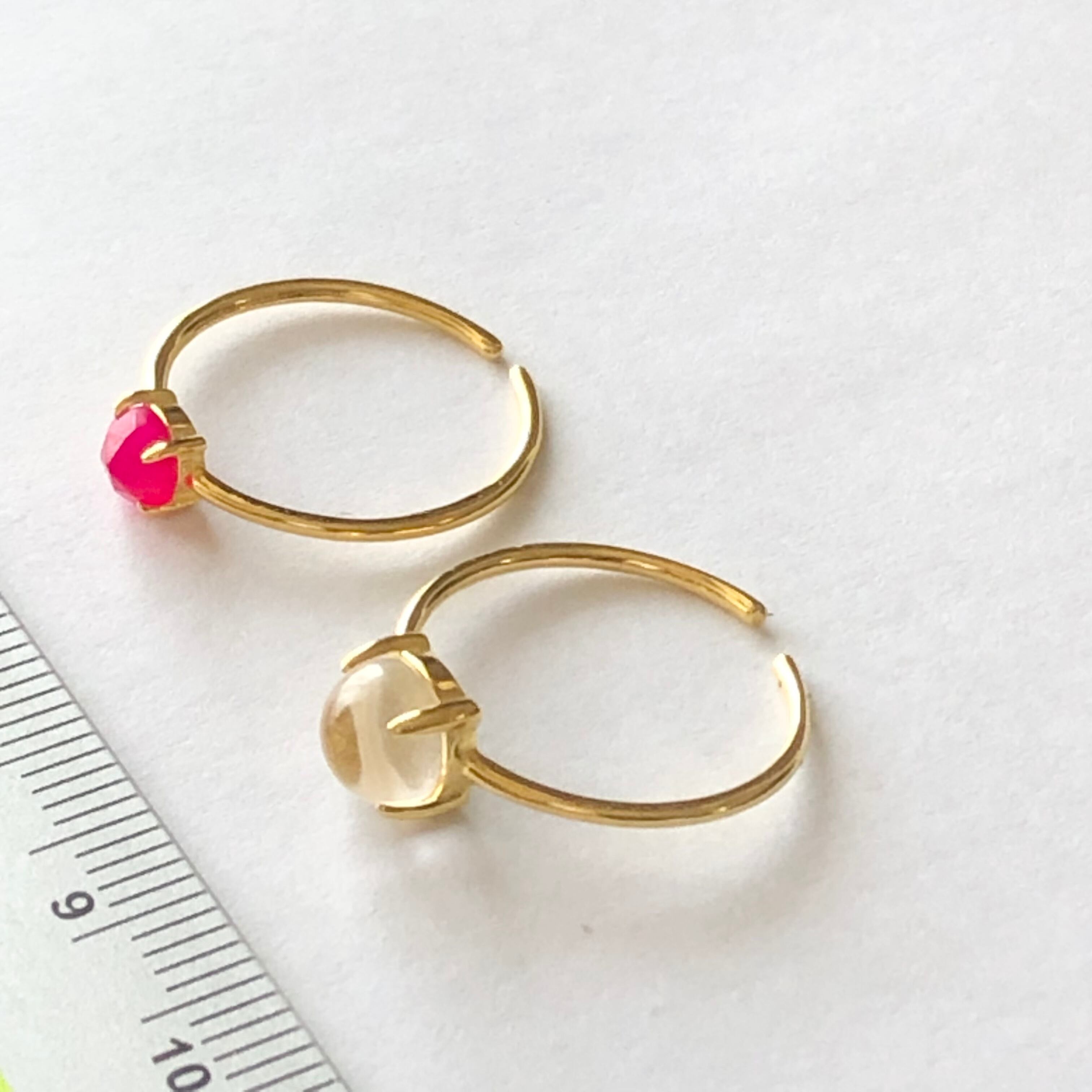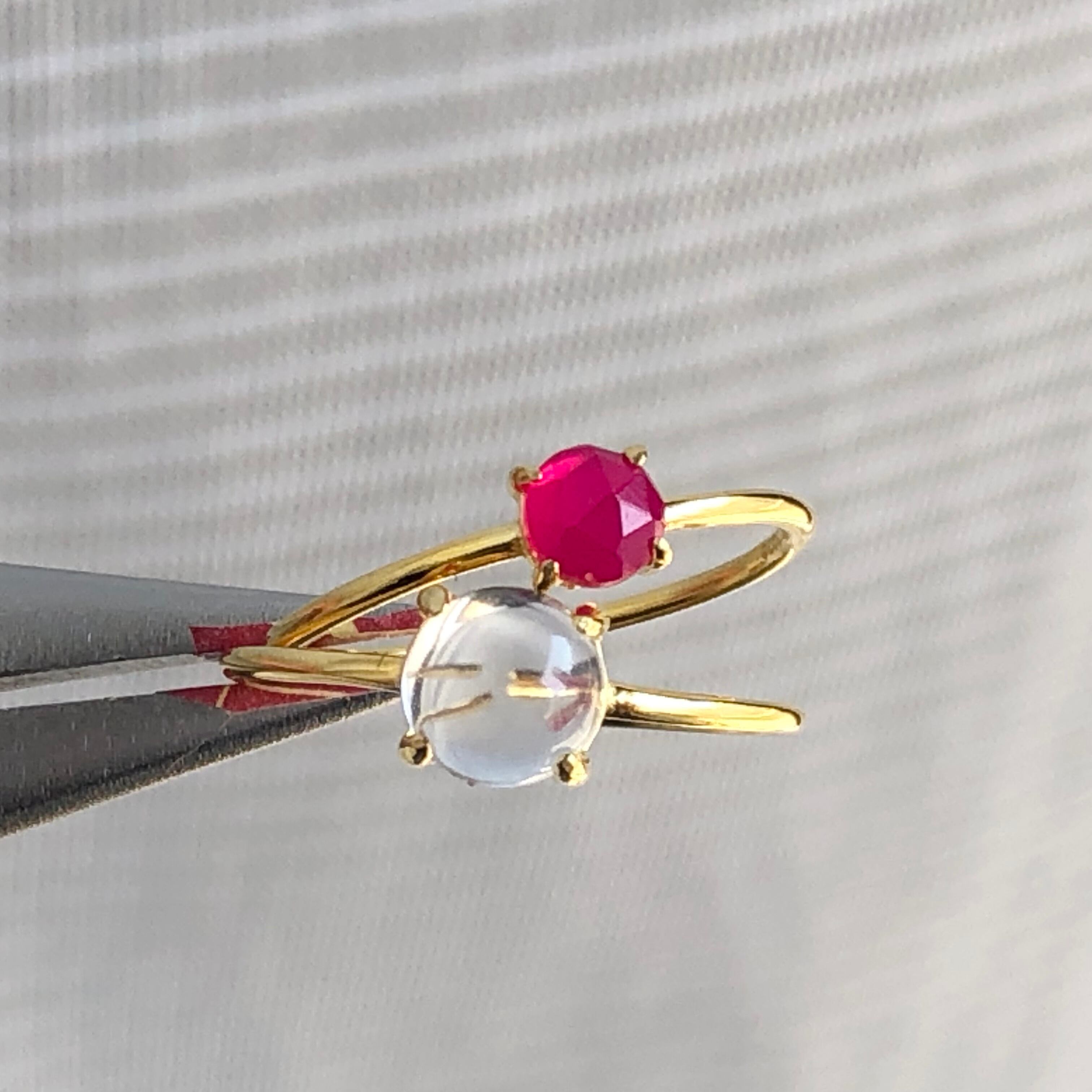 ローズカットのフューシャピンクカルセドニーとクリスタルのリングセットです。