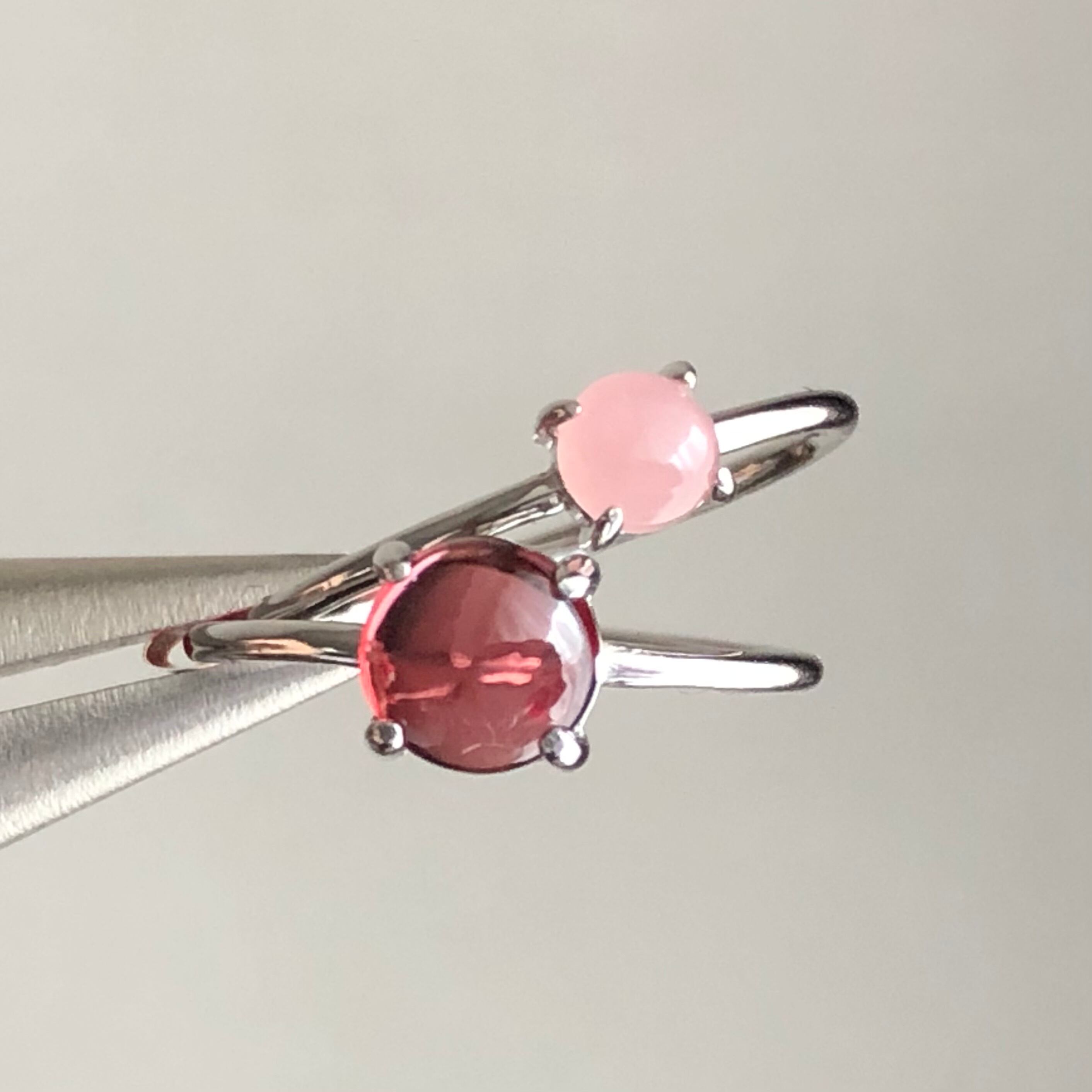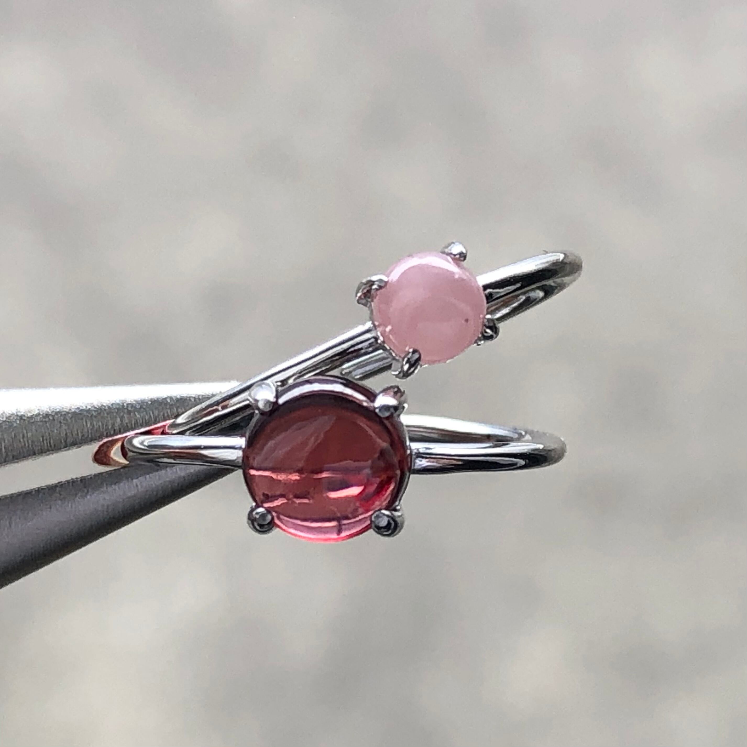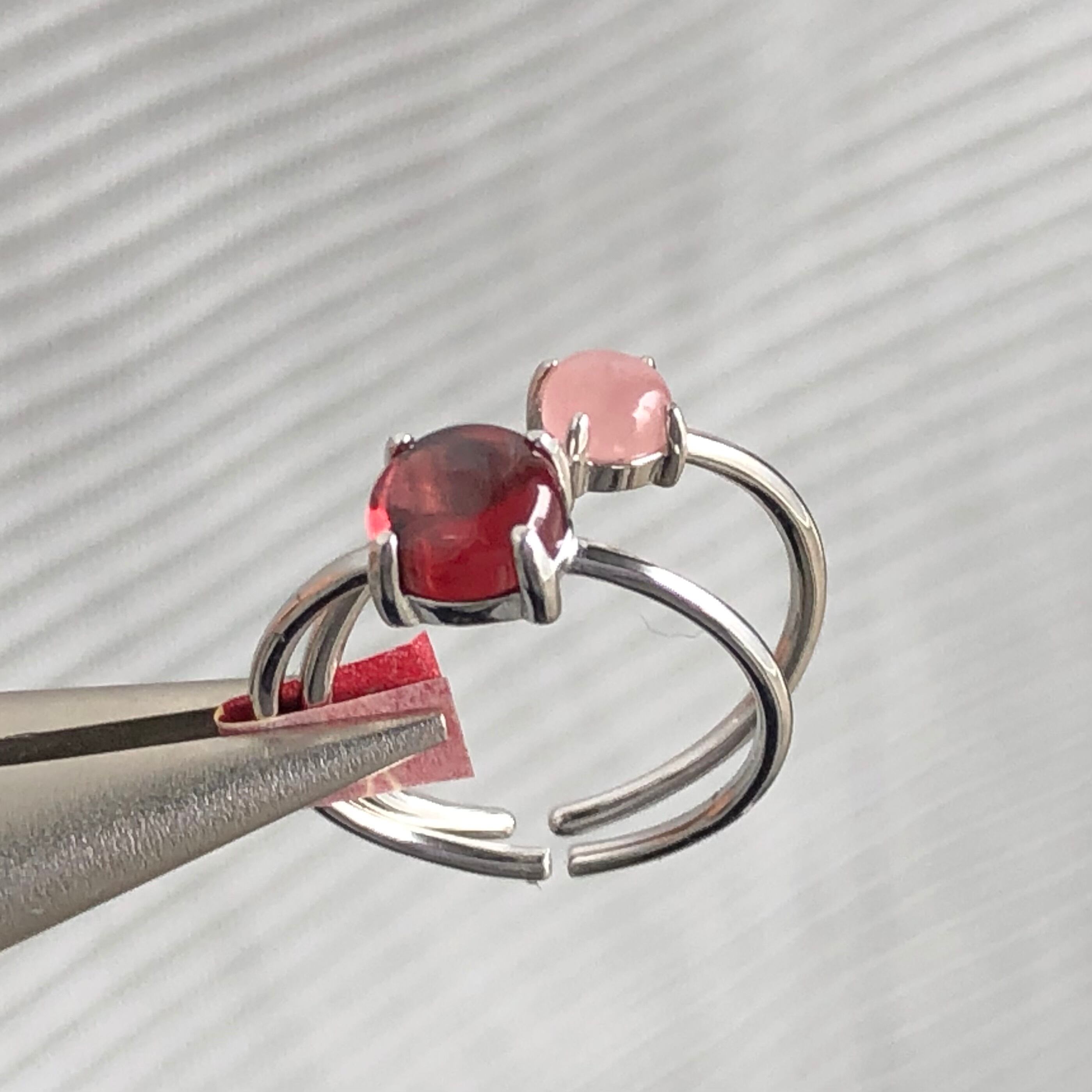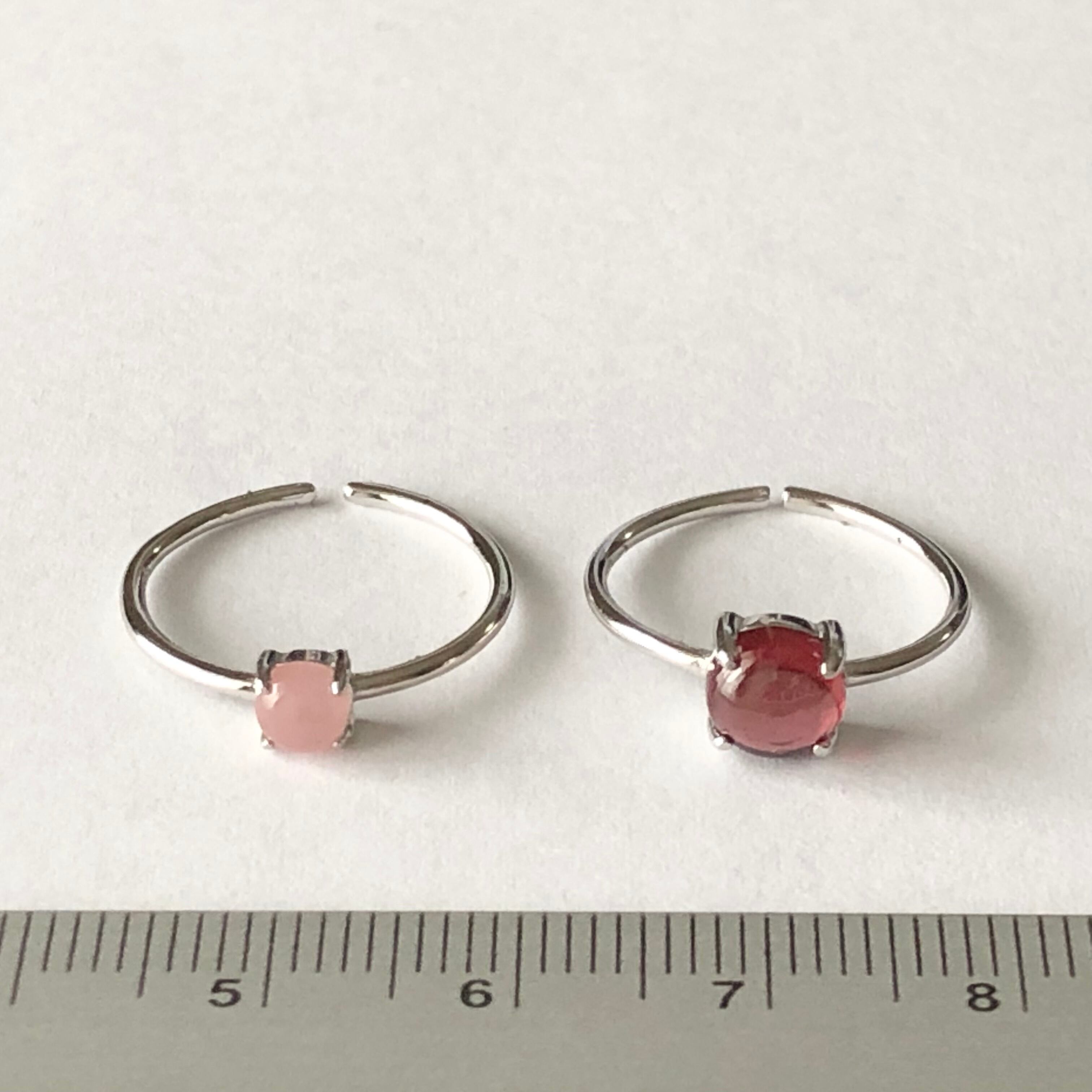 ガーネットとグァバクォーツのリングセットです。