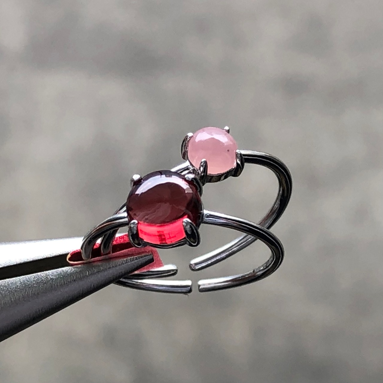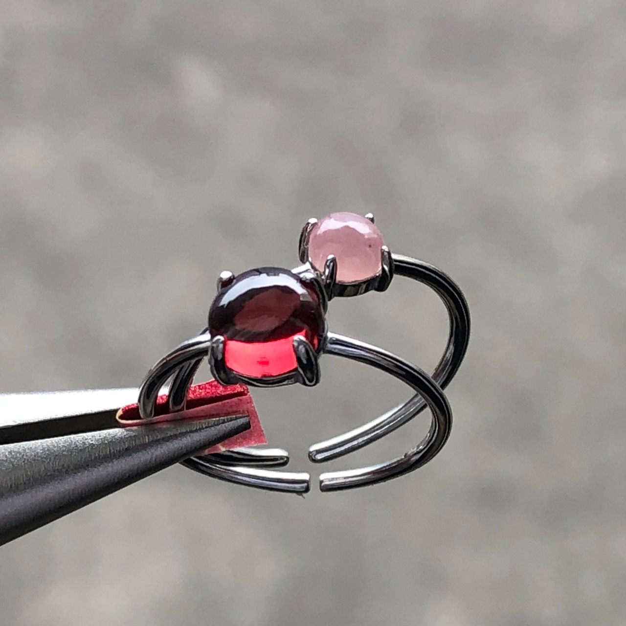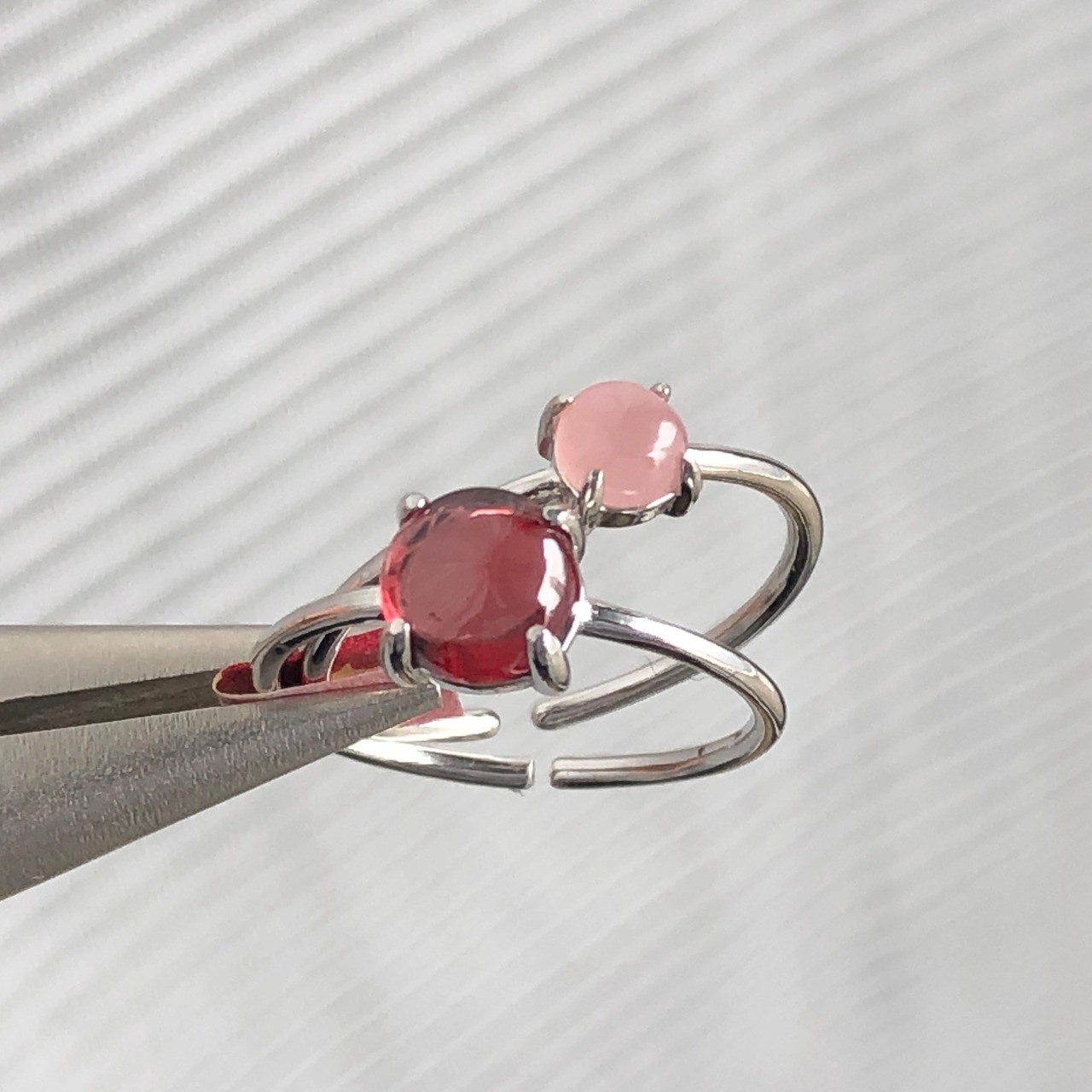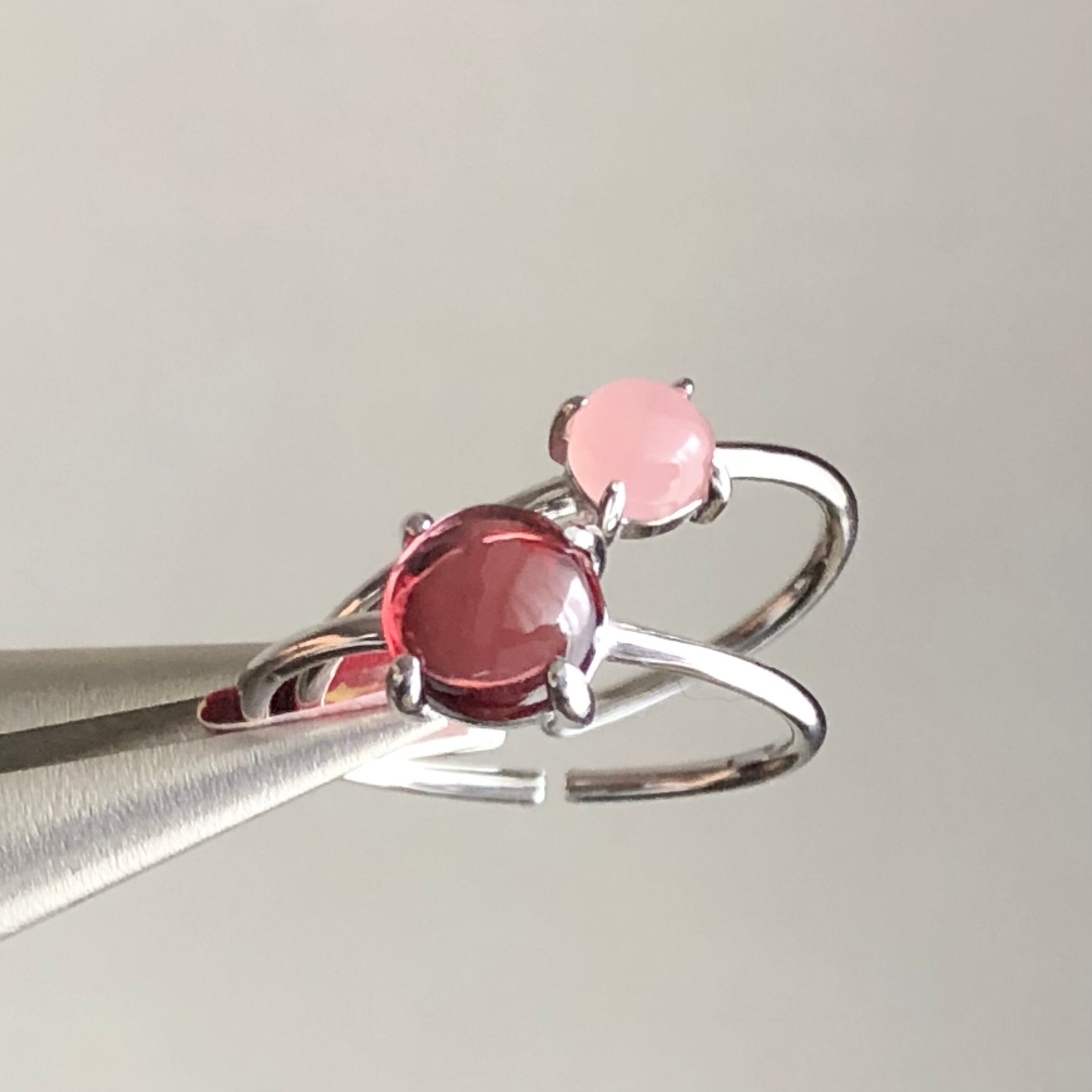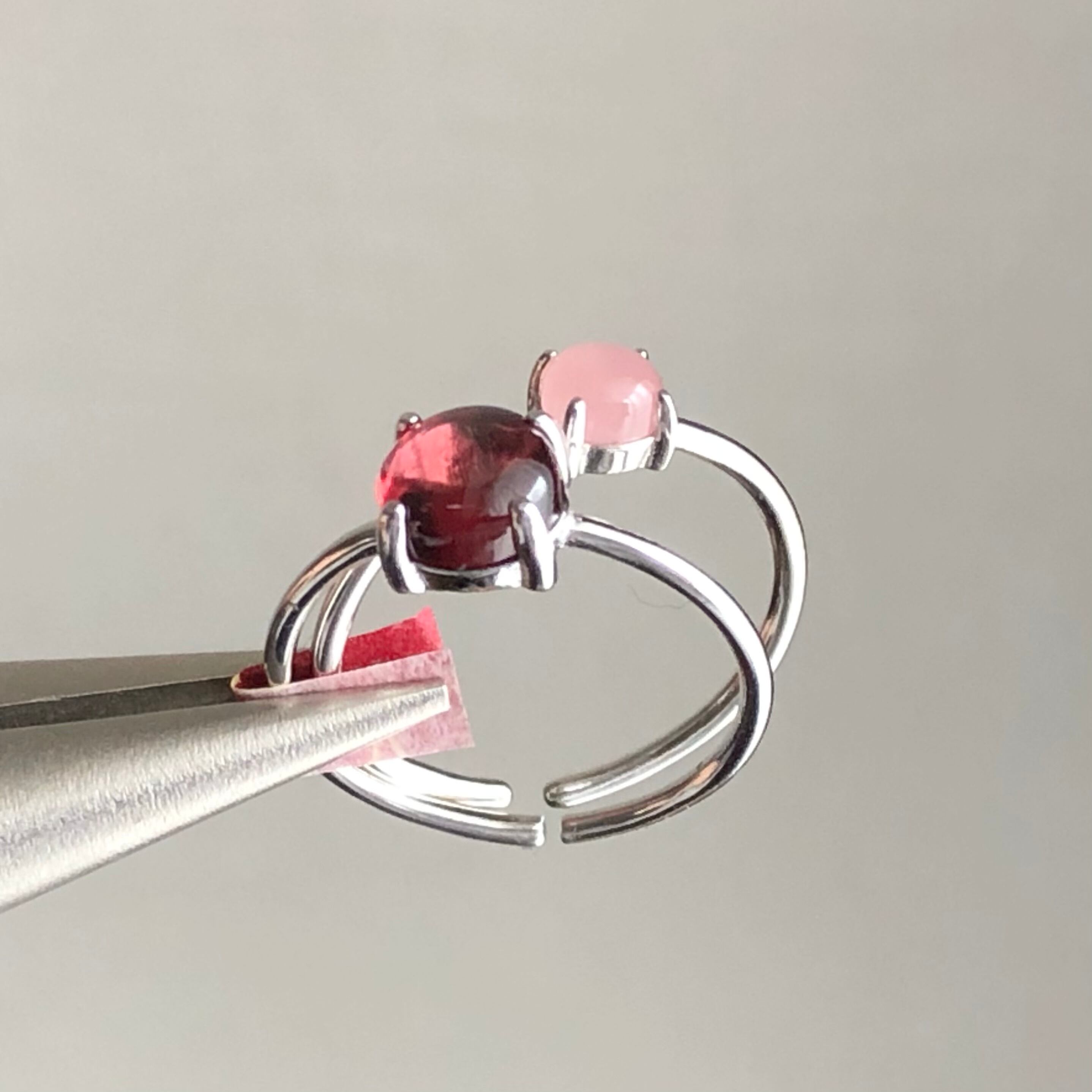 ガーネットとグァバクォーツのリングセットです。