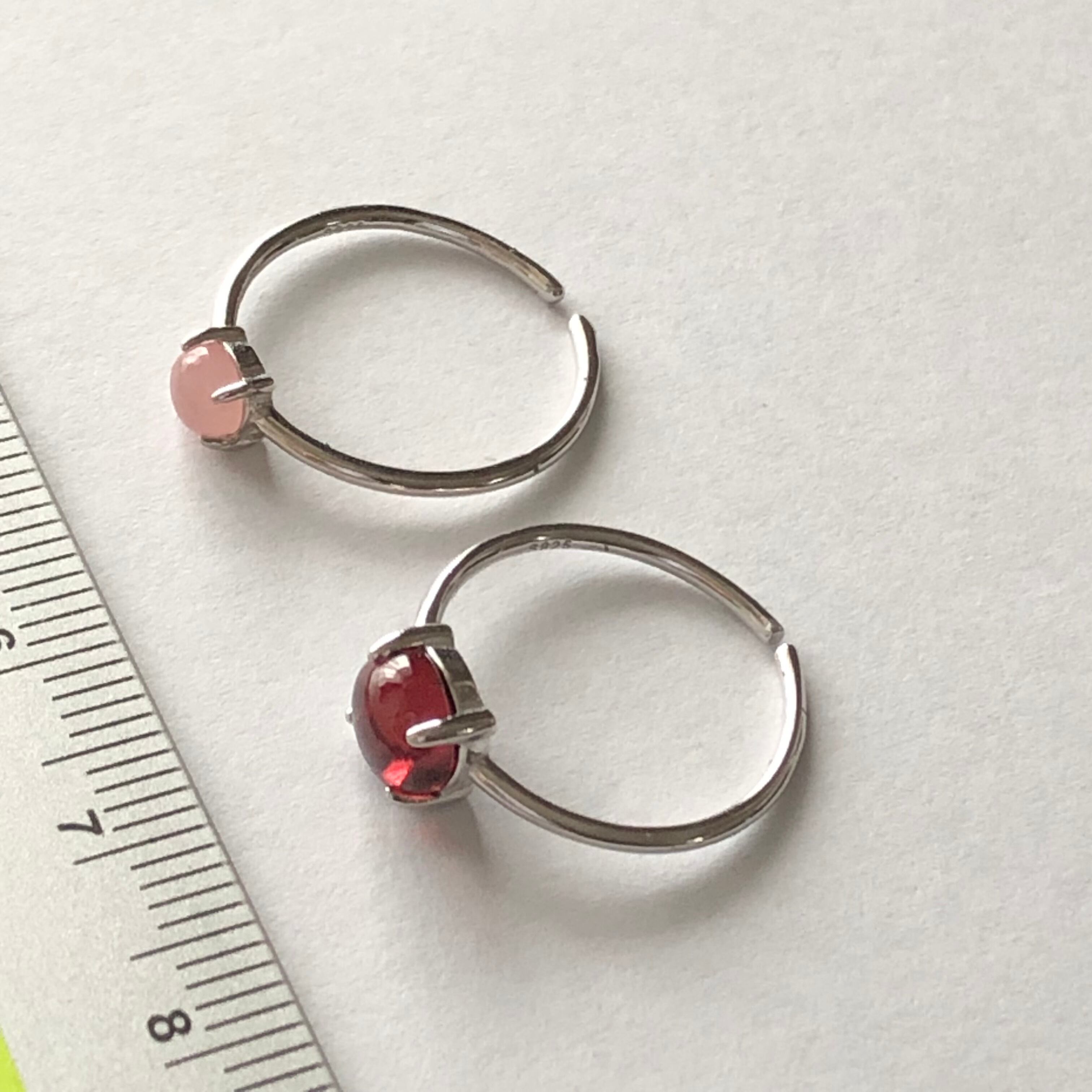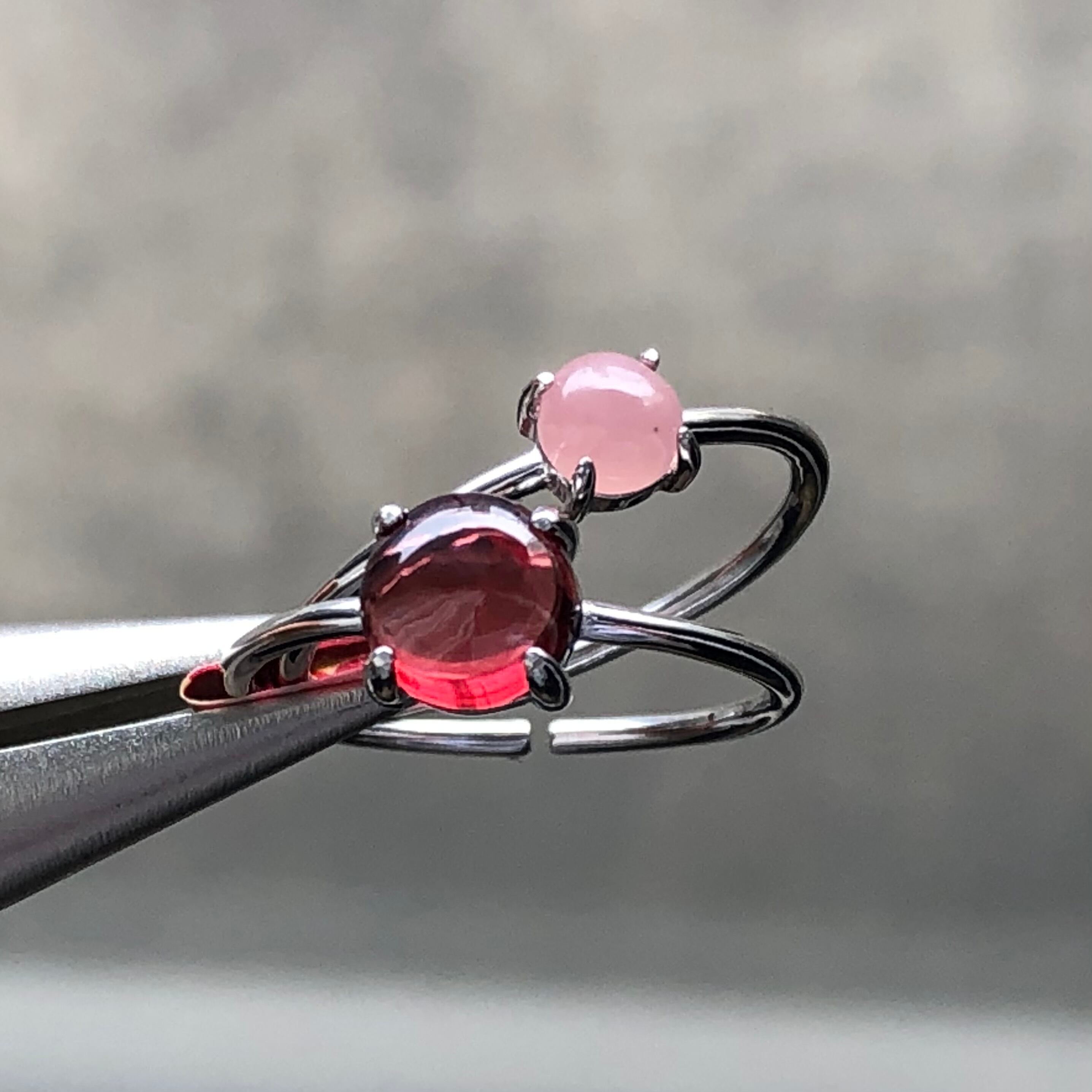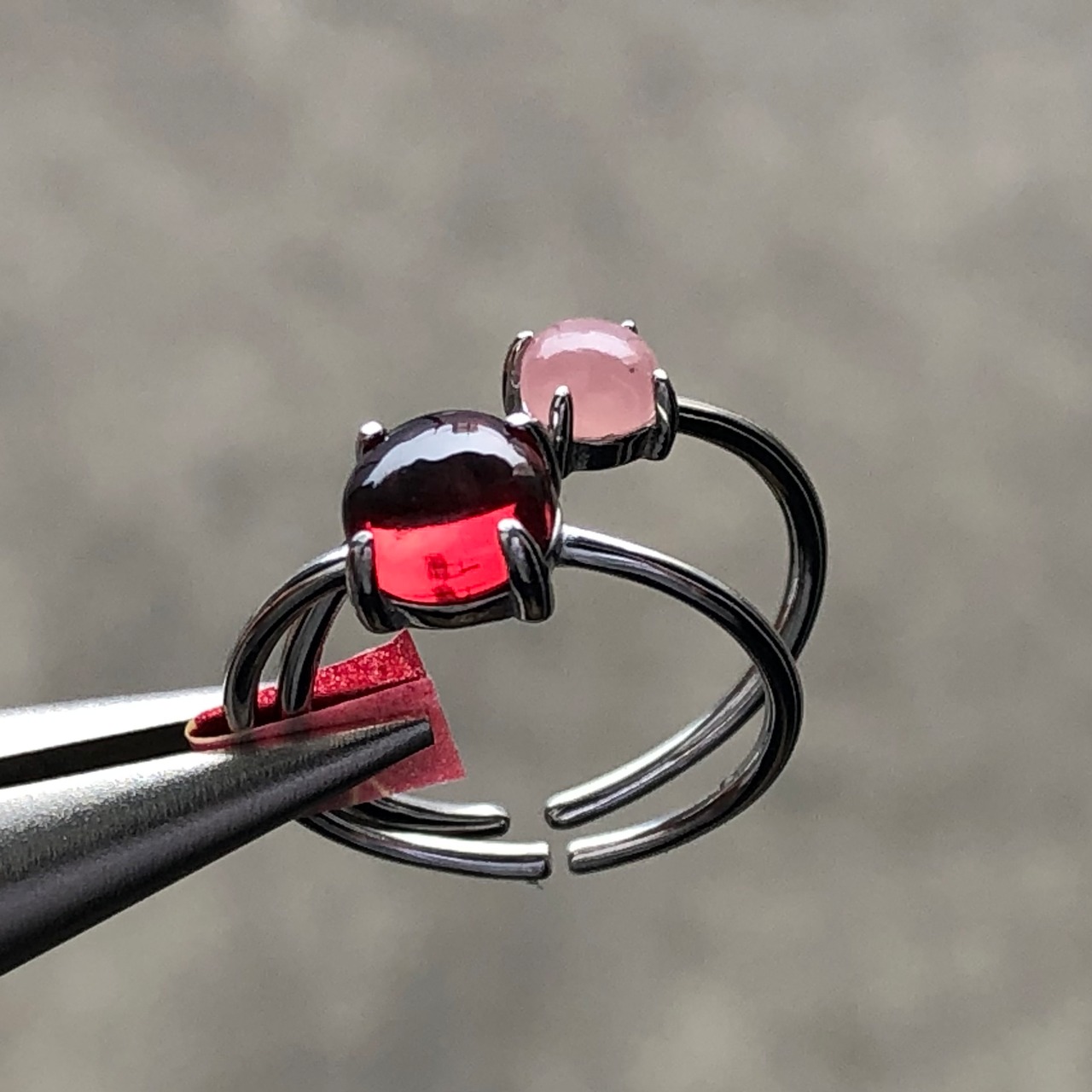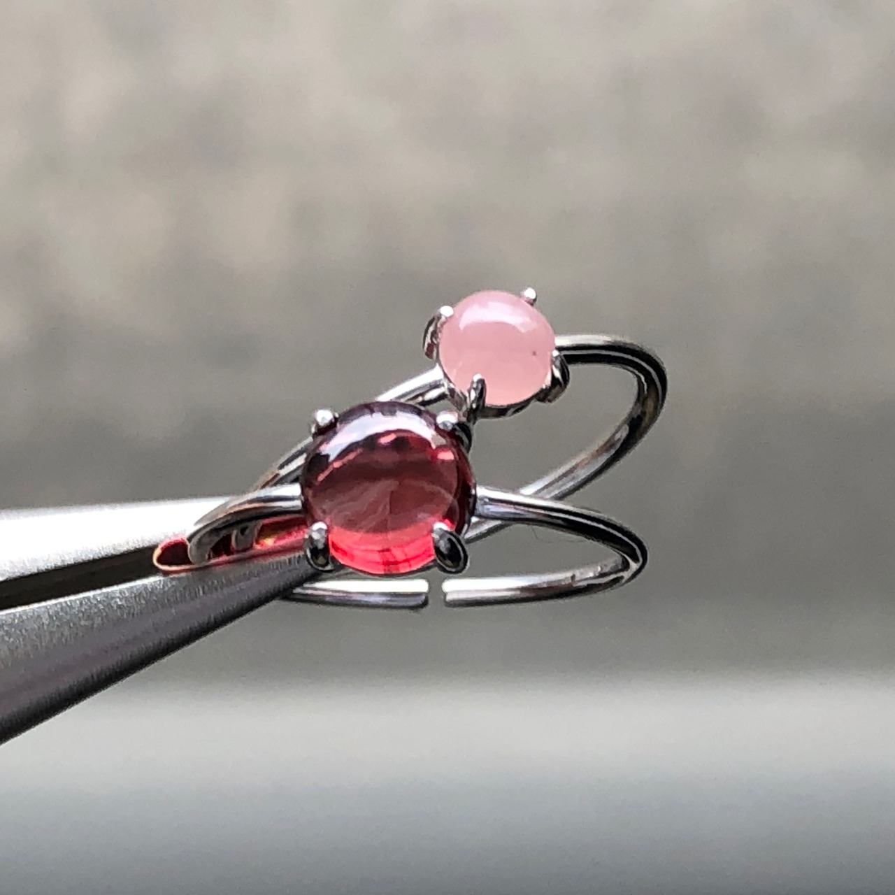 ガーネットとグァバクォーツのリングセットです。
